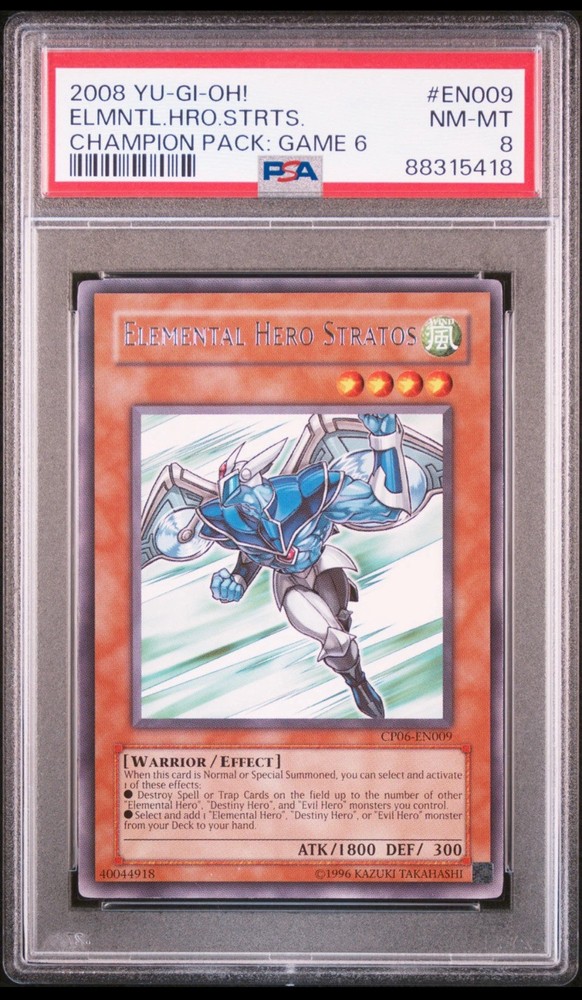 The product is a graded 2008 Yu-Gi-Oh! Champion Pack: Game 6 card of "Elemental Hero Stratos." It has been professionally graded by PSA as an 8. The card number is EN009....