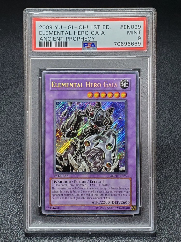 2009 Yugioh ANPR-EN099 Elemental Hero Gaia Secret Rare 1st Edition PSA 9 Mint Condition: PSA 9 Mint Item Description Buyer's Note: You are bidding on the card in the description and pictures shown above. Condition Note: Please see the images provided. Card is sold "As Is", PSA Graded. We will not refund or cancel orders for graded cards, regardless of reason. You may notice some reflection, dust, or debris, most times they are not on card as there can be shadows, reflections, or scuff marks on or above the sleeve surface or on the case. ALL SALES FINAL, NO RETURNS ACCEPTED: Due to the increasingly bad trend of buyers not reading our descriptions or viewing the images properly, we will not comply with requests to cancel the auctions after the fact. Please READ before Buying or Offering. You will are responsible for your purchase and will be issued a non-paying bidder process automatically through eBay should you not make payment for the item you committed to buy. You can view all our items on our eBay Store . Shipping Options & Details Shipping Rates: Please refer to the "Shipping and payments" tab located above. Domestic Shipping Options (United States) USPS 1st Class Mail about 5-10 days USPS Priority Mail about 3-5 days FedEx 2-Day Air about 2 business days (No P.O. Boxes) UPS 2-Day Air about 2 business days (No P.O. Boxes) We do not offer International Shipping through eBay. Payment & Shipping Details At our discretion we reserve the right to remove bids if we believe that it may be harmful to other bidders. We accept the following payments: PayPal, Google Pay, VISA, Master Card, American Express, and Discover . Auction winners are required to make payment in full within 7 days after the auction ends. We allow for combined shipping for multiple auctions that end and are paid for within 7 days of each other. Non-Paying bidder alerts are automatically issued by eBay after 8 days of the 1st unpaid item. Please complete your purchase within this time. We normally process and ship orders by the next business day after payments are received. We do ship via USPS on Saturday's, however since all mail services are unavailable on Sundays, order that occur on Saturday and Sunday will ship on Monday. Orders will be shipped from the following address. Ideal808 650 Iwilei Road #120 Honolulu, HI 96817 Feedback Policy If you are dissatisfied with your eBay purchase, please message us as soon as possible. We will do our best to resolve any problem so that both parties are satisfied with the transaction. Please note that when purchasing cards that are graded by a 3rd party service such as BGS, PSA, CGS, VGA, or WATA we will not accept returns. If further images are needed please send us a message and we will provide them before you decide to purchase the item, however once a transaction for an item such as these above is complete it will be considered closed.