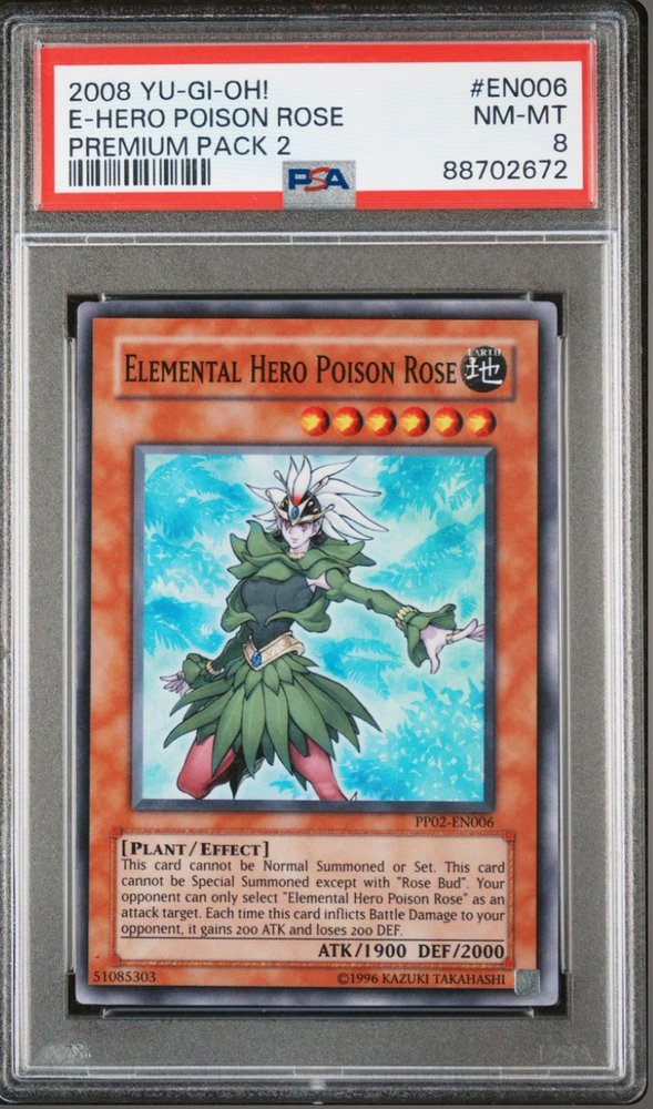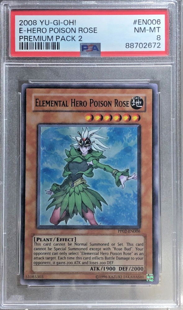This is a 2018 Yu-Gi-Oh! TCG card called Elemental Hero Poison Rose, with card number PP02-EN006. It is from the Premium Pack 2 set and is made of card stock with a foil finish. The card is in PSA 8 NM-MINT condition and was manufactured by Konami in the United States. It is in English and suitable for ages 6+. Thanks For Looking.