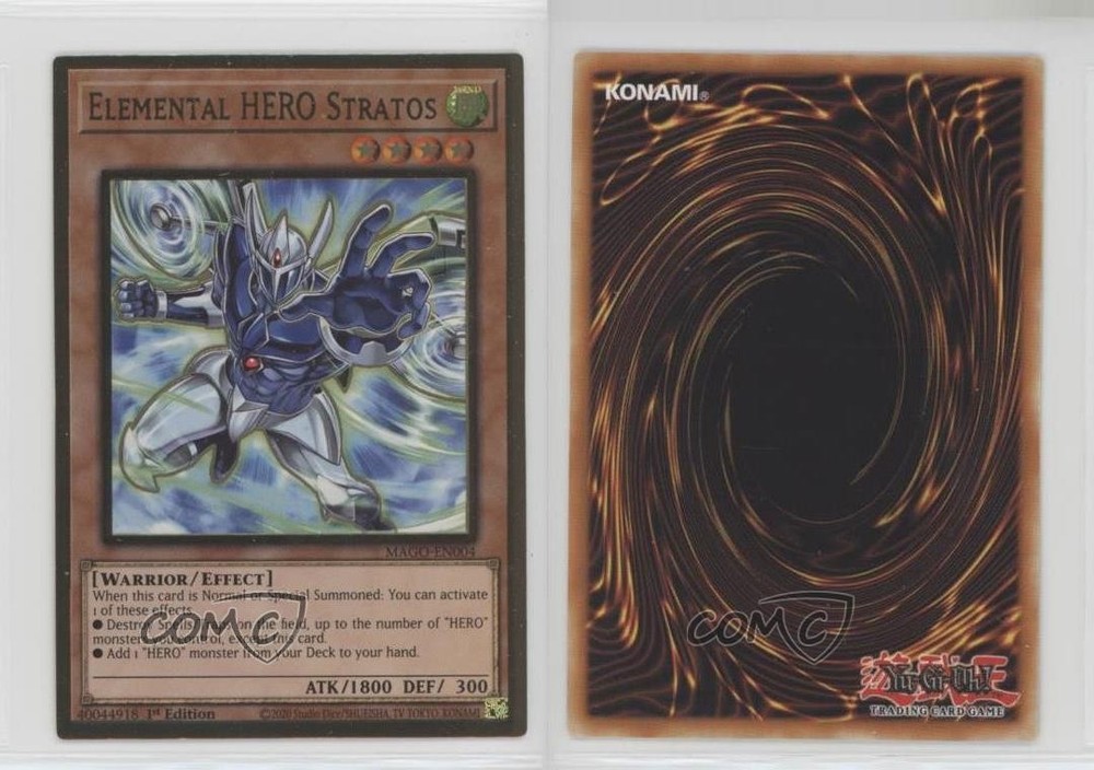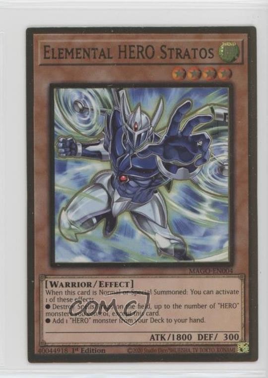This 1st Edition Elemental HERO Stratos from Maximum Gold is absolutely stunning! The premium gold foil really makes the artwork pop, and the card arrived in perfect condition. As a key staple in HERO decks, it's both a collector's dream and a competitive player's must-have. Super happy with the purchase—fast shipping and great packaging from COMC. Highly recommend for any Yu-Gi-Oh! fan!