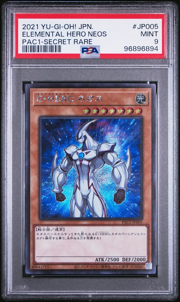 2021 YU-GI-OH! JAPANESE PAC1-PRISMATIC ART COLLECTION SECRET RARE #JP005 ELEMENTAL HERO NEOS PSA 9 2021 YU-GI-OH! JAPANESE PAC1-PRISMATIC ART COLLECTION SECRET RARE #JP005 ELEMENTAL HERO NEOS PSA 9 Purchase Info Thank you for your interest in this item consigned with PSA! By purchasing or making an offer on this item, you acknowledge and agree to the following terms: All sales are final. Returns not accepted. Payment must be made upon purchase of the item. All items are sold "as is" and without warranty of Collectors Universe, Inc. (d/b/a PSA), and ANY AND ALL IMPLIED WARRANTIES ARE DISCLAIMED AND EXCLUDED. Sales tax may apply depending on shipping address. PSA does not guarantee that another third-party grading company's authentication or certification of an item as genuine is correct or accurate. Neither a difference of opinion between third-party grading companies about authenticity, nor a company's subsequent reversal of its earlier authentication or certification of an item, will be a basis for rescinding a sale. Any dispute with another third-party grading company relating to the authenticity of an item must be resolved directly with that other company. Collectors' maximum liability in the event of loss or damage to an item during shipping will be the lesser of (a) the price paid for the item and (b) the change in fair market value of the item. You release Collectors from all other liability including for any claims of punitive damages, emotional distress, consequential damages, lost profits, or lost interest, except as prohibited by law. Shipping Purchased Items will be shipped directly from PSA Vault. You stay hands-free. PSA Vault When you purchase this item, you can save on sales tax and selling fees by keeping it in the PSA Vault, official Vault of eBay. Items already in PSA Vault and will be sent to PSA Vault will have no shipping charge Storage of any items with the PSA Vault will be subject to the PSA Vault Terms of Service. Consignment PSA has competitive rates on the world's largest collectibles marketplace with the option to list from the PSA Vault or immediately after PSA authentication and grading. Sale Price Under $100 $100 - $499 $500 - $999 $1,000 - $2,499 $2,500 - $4,999 $5,000+ Seller Fee 16% 14% 13% 10% 9% 7% Sellers pay a single fee as reflected above; no additional eBay fees are incurred. There is a $5 minimum fee on sold items.