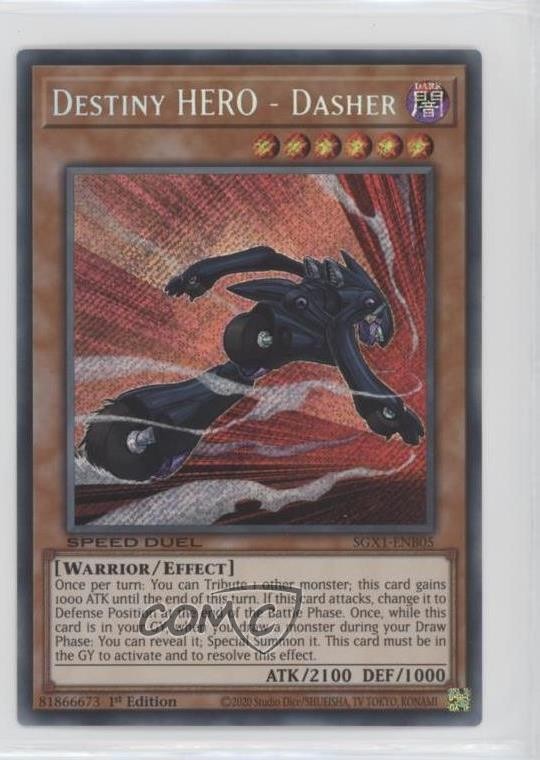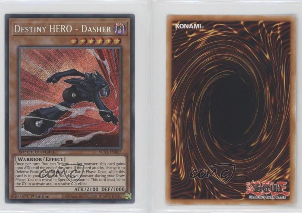 2022 Yu-Gi-Oh! Speed Duel GX: Duel Academy Box - [Base] - 1st Edition #SGX1-ENB05 SCR - Destiny HERO - Dasher COMC Item: 139530732 - YuGiOh Card - Featuring Destiny HERO - Dasher Search for more: 2022 Yu-Gi-Oh! Speed Duel GX: Duel Academy Box Search for more: 2022 Yu-Gi-Oh! Speed Duel GX: Duel Academy Box - [Base] - 1st Edition View all of our Listings Auctions Buy It Now About Us Located in the beautiful Pacific Northwest, COMC (Check Out My Cards) is the world's largest consignment service for trading card singles. More than 10,000 people have used our consignment service to list over 50 million trading cards. Find out how we can help you consign your items on eBay by contacting us through eBay messaging. COMC -- "The Safe & Easy Way to Buy & Sell" Raw Condition for Modern Cards Unless otherwise noted, raw modern cards are listed in Near Mint-Mint condition or better. A NM-MT card appears to be Mint at first glance, but upon closer inspection, may exhibit some of the following: minor print defects (e.g. roller marks, print line, dimple), minor scratches, slight edge wear, and slight corner wear. Centering is clearly visible in the images provided and does not factor into our condition assessment. Raw Condition for Vintage Cards Unless otherwise noted, raw vintage cards are listed in Excellent condition or better. An EX card may exhibit some of the following: minor rounding of corners, surface wear, print defects, light scratches, and slight edge wear/chipping. Centering is clearly visible in the images provided and does not factor into our condition assessment. Domestic Shipping Combined shipping for multiple items is available. To receive combined shipping, please ensure all desired items are in your eBay shopping cart before proceeding to checkout. eBay limits orders to 40 items per order. We automatically combine multiple orders placed on the same day. If you place multiple orders on the same day, please contact us to request a refund of applicable shipping costs. Signature confirmation may be required on invoices over $400. All cards are protected and shipped securely. International Shipping COMC offers eBay's International Shipping (EIS) for international orders under $2,500* (see country exceptions below). All duties and import fees are paid at checkout; in the rare event that there are additional import fees upon delivery, these are borne by the buyer. EIS packages route through a shipping hub in Erlanger, KY before shipping to their final destination. Please note that EIS does not allow for combined shipments. The shipping rates are determined by eBay and cannot be adjusted. *Maximum sale price exceptions: Colombia, Kuwait ($2,000); Taiwan ($1,539); Chile, Costa Rica, Guatemala, Honduras, Trinidad and Tobago ($1,000); Antigua and Barbuda, Aruba, Belize, Dominica, Grenada, Philippines, Saint Kitts and Nevis, Saint Lucia, Montserrat, Turks and Caicos Islands ($500); Dominican Republic, El Salvador ($200). Please request a shipping quote through eBay messaging for orders that exceed the maximum sale price supported by eBay's International Shipping. You will be responsible for all duties and import fees for international orders shipped outside the EIS. All cards are protected and shipped securely. Payment COMC does not accept offers on our cards through our eBay storefront. COMC utilizes eBay’s managed payments system. If you are experiencing difficulties making a payment, please contact eBay for assistance. Return Policy Returns are only accepted on the rare occasion the item is not as described. If you are making a return, please initiate the return process through eBay so a mailing label can be provided for you. Prior to listing, our expert team carefully assessed this item to represent it accurately. Please review the description and high-definition images prior to purchasing to ensure this item meets your satisfaction. We welcome you to contact us if you have further questions about this item. Trust and Integrity COMC carefully assesses each item consigned to us to prevent fraudulent items from entering the marketplace. If you believe an item offered on COMC may be fraudulent, please contact us with details so we can investigate the issue. Items we determine are outside our supported items policy may be removed. Last Modified: 5/20/2025 3:01:25 AM PDT