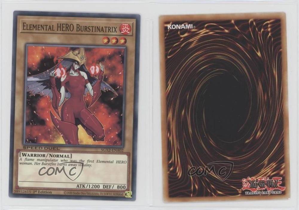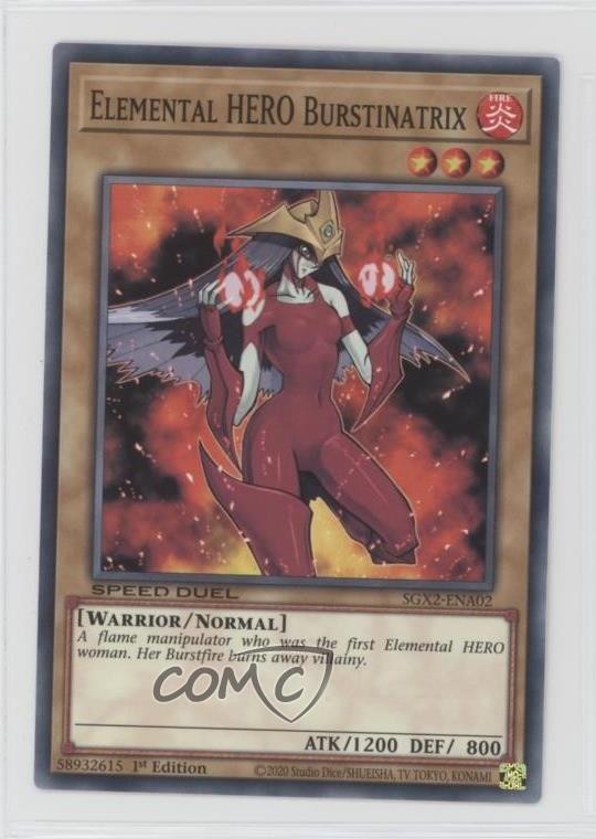 2022 Yu-Gi-Oh! Speed Duel GX: Midterm Paradox - [Base] - 1st Edition #SGX2-ENA02 Elemental HERO Burstinatrix COMC Item: 177000287 - YuGiOh Card - Featuring Elemental HERO Burstinatrix Search for more: 2022 Yu-Gi-Oh! Speed Duel GX: Midterm Paradox Search for more: 2022 Yu-Gi-Oh! Speed Duel GX: Midterm Paradox - [Base] - 1st Edition View all of our Listings Auctions Buy It Now About Us Located in the beautiful Pacific Northwest, COMC (Check Out My Cards) is the world's largest consignment service for trading card singles. More than 10,000 people have used our consignment service to list over 50 million trading cards. Find out how we can help you consign your items on eBay by contacting us through eBay messaging. COMC -- "The Safe & Easy Way to Buy & Sell" Raw Condition for Modern Cards Unless otherwise noted, raw modern cards are listed in Near Mint-Mint condition or better. A NM-MT card appears to be Mint at first glance, but upon closer inspection, may exhibit some of the following: minor print defects (e.g. roller marks, print line, dimple), minor scratches, slight edge wear, and slight corner wear. Centering is clearly visible in the images provided and does not factor into our condition assessment. Raw Condition for Vintage Cards Unless otherwise noted, raw vintage cards are listed in Excellent condition or better. An EX card may exhibit some of the following: minor rounding of corners, surface wear, print defects, light scratches, and slight edge wear/chipping. Centering is clearly visible in the images provided and does not factor into our condition assessment. Domestic Shipping Combined shipping for multiple items is available. To receive combined shipping, please ensure all desired items are in your eBay shopping cart before proceeding to checkout. eBay limits orders to 40 items per order. We automatically combine multiple orders placed on the same day. If you place multiple orders on the same day, please contact us to request a refund of applicable shipping costs. Signature confirmation may be required on invoices over $400. All cards are protected and shipped securely. International Shipping COMC offers eBay's International Shipping (EIS) for international orders under $2,500* (see country exceptions below). All duties and import fees are paid at checkout; in the rare event that there are additional import fees upon delivery, these are borne by the buyer. EIS packages route through a shipping hub in Erlanger, KY before shipping to their final destination. Please note that EIS does not allow for combined shipments. The shipping rates are determined by eBay and cannot be adjusted. *Maximum sale price exceptions: Colombia, Kuwait ($2,000); Taiwan ($1,539); Chile, Costa Rica, Guatemala, Honduras, Trinidad and Tobago ($1,000); Antigua and Barbuda, Aruba, Belize, Dominica, Grenada, Philippines, Saint Kitts and Nevis, Saint Lucia, Montserrat, Turks and Caicos Islands ($500); Dominican Republic, El Salvador ($200). Please request a shipping quote through eBay messaging for orders that exceed the maximum sale price supported by eBay's International Shipping. You will be responsible for all duties and import fees for international orders shipped outside the EIS. All cards are protected and shipped securely. Payment COMC does not accept offers on our cards through our eBay storefront. COMC utilizes eBay’s managed payments system. If you are experiencing difficulties making a payment, please contact eBay for assistance. Return Policy Returns are only accepted on the rare occasion the item is not as described. If you are making a return, please initiate the return process through eBay so a mailing label can be provided for you. Prior to listing, our expert team carefully assessed this item to represent it accurately. Please review the description and high-definition images prior to purchasing to ensure this item meets your satisfaction. We welcome you to contact us if you have further questions about this item. Trust and Integrity COMC carefully assesses each item consigned to us to prevent fraudulent items from entering the marketplace. If you believe an item offered on COMC may be fraudulent, please contact us with details so we can investigate the issue. Items we determine are outside our supported items policy may be removed. Last Modified: 7/4/2025 6:47:09 PM PDT