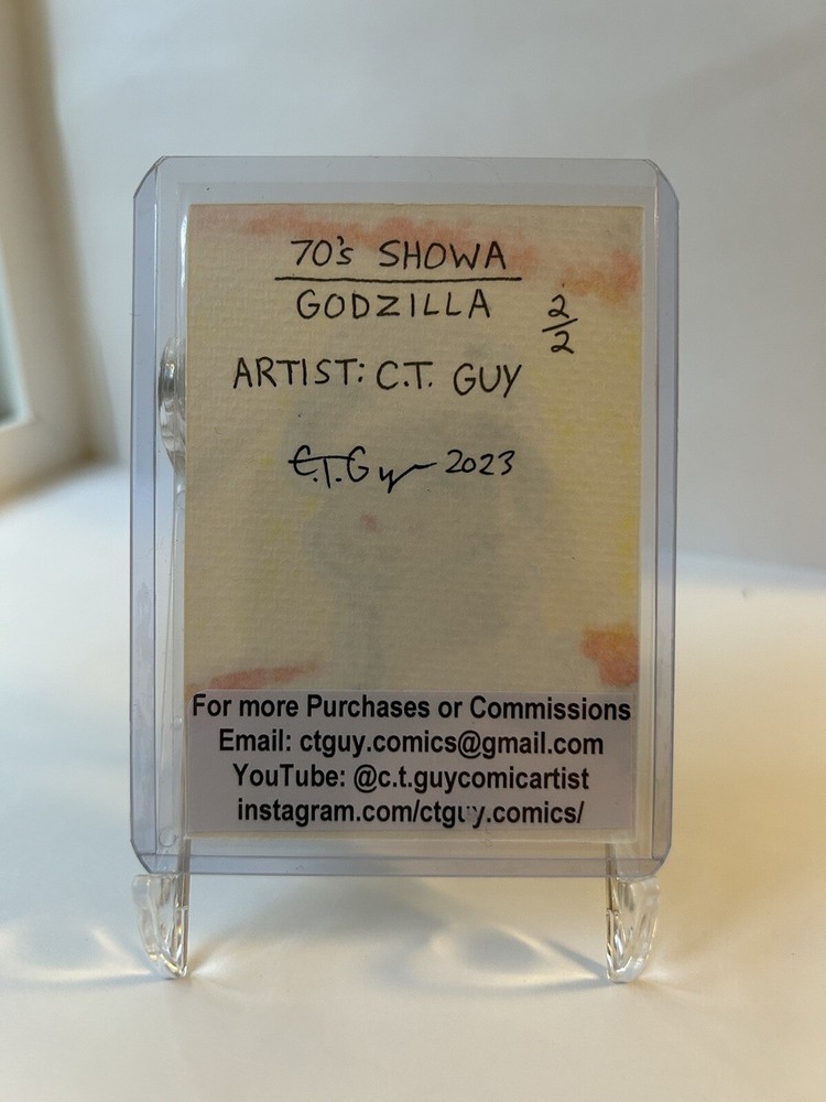 This Godzilla trading card is a must-have for fans! The 70’s Showa-style artwork by C.T. Guy is vibrant and nostalgic, capturing the iconic kaiju perfectly. The card is high-quality, signed by the artist, and arrives safely in a penny sleeve and top loader. A fantastic addition to any collection!