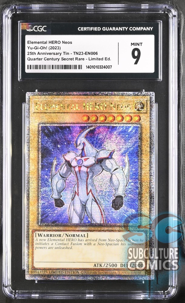 YU-GI-OH ELEMENTAL HERO NEOS 25TH ANNIVERSARY TIN QUARTER CENTURY PRISMATIC SECRET RARE LIMITED EDITION CERTIFIED CGC 9.0 MINT !! IN STOCK – READY TO SHIP !! YU-GI-OH ELEMENTAL HERO NEOS Graded CGC 9.0 MINT PLEASE NOTE: CGC HOLDERS ARE CLEAR. THIS WAS SCANNED ON A BLACK BACKGROUND. !! IN STOCK – READY TO SHIP !! Please feel free to contact us with any questions.