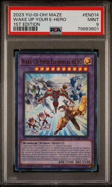 2023 Yugioh! Wake Up Your Elemental HERO MAZE-EN014 Ultra Rare 1st Ed PSA 9 Card ships with care in 2 business days via USPS with tracking. Cards that sell for $125+ are insured at no additional cost. We ship to the U.S. only. Let us know if you have any questions. Full payment must be made within 4 business days or we will escalate with eBay. Do not bid, BIN or make an offer unless you are a serious buyer. We use a Fujistu FI-8170 high-res scanner that is designed for sports cards. This scanner does not show negative space, but rest assured, the listing photo shows 100% of the card without any part of it being cut off. Prior to placing a bid, please carefully review the raw, high-res photos of the exact card being sold to make your own assessment of the card. We are not professional graders and cannot guarantee that any of our cards will grade to a specific level. All of our cards should be considered NM-MT or better. Thanks for looking and please check out the dozens of other cards we have listed as well as our 100% positive feedback! We combine shipping! N8487