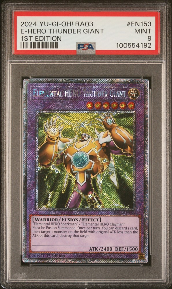2024 YU-GI-OH! RA03-QUARTER CENTURY BONANZA 1ST EDITION #EN153 ELEMENTAL HERO THUNDER GIANT PSA 9 2024 YU-GI-OH! RA03-QUARTER CENTURY BONANZA 1ST EDITION #EN153 ELEMENTAL HERO THUNDER GIANT PSA 9 Purchase Info Thank you for your interest in this item consigned with PSA! By purchasing or making an offer on this item, you acknowledge and agree to the following terms: All sales are final. Returns not accepted. Payment must be made upon purchase of the item. All items are sold "as is" and without warranty of Collectors Universe, Inc. (d/b/a PSA), and ANY AND ALL IMPLIED WARRANTIES ARE DISCLAIMED AND EXCLUDED. Sales tax may apply depending on shipping address. PSA does not guarantee that another third-party grading company's authentication or certification of an item as genuine is correct or accurate. Neither a difference of opinion between third-party grading companies about authenticity, nor a company's subsequent reversal of its earlier authentication or certification of an item, will be a basis for rescinding a sale. Any dispute with another third-party grading company relating to the authenticity of an item must be resolved directly with that other company. Collectors' maximum liability in the event of loss or damage to an item during shipping will be the lesser of (a) the price paid for the item and (b) the change in fair market value of the item. You release Collectors from all other liability including for any claims of punitive damages, emotional distress, consequential damages, lost profits, or lost interest, except as prohibited by law. Shipping Purchased Items will be shipped directly from PSA Vault. You stay hands-free. PSA Vault When you purchase this item, you can save on sales tax and selling fees by keeping it in the PSA Vault, official Vault of eBay. Items already in PSA Vault and will be sent to PSA Vault will have no shipping charge Storage of any items with the PSA Vault will be subject to the PSA Vault Terms of Service. Consignment PSA has competitive rates on the world's largest collectibles marketplace with the option to list from the PSA Vault or immediately after PSA authentication and grading. Sale Price Under $100 $100 - $499 $500 - $999 $1,000 - $2,499 $2,500 - $4,999 $5,000+ Seller Fee 16% 14% 13% 10% 9% 7% Sellers pay a single fee as reflected above; no additional eBay fees are incurred. There is a $5 minimum fee on sold items.