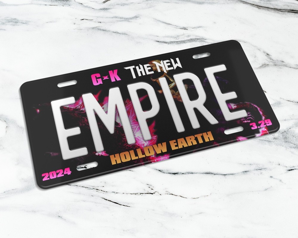 2024 movie Godzilla x Kong: The New Empire license plate. Aluminum vanity plate, room decor, wall art, car accessories. An exclusive aluminum license plate. This gorgeous license plate was inspired by your favorite movie . Measuring 12" x 6" (30.5 × 15.2 cm), it is the perfect size to decorate your car or house wall as a stylish piece. Your place should reflect who you are and what you care about. Adding a pop of color to your space is an easy way to inject some personality and put a smile on your face. It also makes a lovely gift for friends and family. **NOTE: It's a decorative item. Please check your local state legislation regarding Vanity Plate usage before ordering and using it legally for your car. MATERIAL: Each plate is 100% made of robust aluminum which is a strong and light material with silver-colored backing. The holes are drilled into the frame along the edges to make the installation or hanging process easy and hassle-free. The product does not come with mounting hardware. CARE INSTRUCTIONS: To clean it, please wipe with a damp cloth, air dry, or use a soft, non-abrasive cloth. SHIPPING: Y our item will get shipped out within 2-5 business days, while the delivery time should depend on your location. COLOR DISCLAIMER: MANY FACTORS AFFECT COLOR, HOW WE SEE IT ON SCREEN, AND HOW IT PRINTS. YOUR COMPUTER OR DEVICE’S SCREEN MAY DISPLAY THE COLORS DIFFERENTLY FROM HOW THEY WILL PRINT. EVEN THOUGH THE COLORS WILL MATCH AS CLOSELY AS POSSIBLE, YOUR FINAL PRODUCT MAY BE SLIGHTLY DIFFERENT IN THE LOOK OF THE COLORS.
