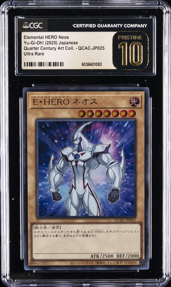 2025 YU-GI-OH! JAPANESE QUARTER CENTURY ART COLL. - ULTRA RARE #QCAC-JP025 ELEMENTAL HERO NEOS CGC 10 PERFECT 2025 YU-GI-OH! JAPANESE QUARTER CENTURY ART COLL. - ULTRA RARE #QCAC-JP025 ELEMENTAL HERO NEOS CGC 10 PERFECT Purchase Info Thank you for your interest in this item consigned with PSA! By purchasing or making an offer on this item, you acknowledge and agree to the following terms: All sales are final. Returns not accepted. Payment must be made upon purchase of the item. All items are sold "as is" and without warranty of Collectors Universe, Inc. (d/b/a PSA), and ANY AND ALL IMPLIED WARRANTIES ARE DISCLAIMED AND EXCLUDED. Sales tax may apply depending on shipping address. PSA does not guarantee that another third-party grading company's authentication or certification of an item as genuine is correct or accurate. Neither a difference of opinion between third-party grading companies about authenticity, nor a company's subsequent reversal of its earlier authentication or certification of an item, will be a basis for rescinding a sale. Any dispute with another third-party grading company relating to the authenticity of an item must be resolved directly with that other company. Collectors' maximum liability in the event of loss or damage to an item during shipping will be the lesser of (a) the price paid for the item and (b) the change in fair market value of the item. You release Collectors from all other liability including for any claims of punitive damages, emotional distress, consequential damages, lost profits, or lost interest, except as prohibited by law. Shipping Purchased Items will be shipped directly from PSA Vault. You stay hands-free. PSA Vault When you purchase this item, you can save on sales tax and selling fees by keeping it in the PSA Vault, official Vault of eBay. Items already in PSA Vault and will be sent to PSA Vault will have no shipping charge Storage of any items with the PSA Vault will be subject to the PSA Vault Terms of Service. Consignment PSA has competitive rates on the world's largest collectibles marketplace with the option to list from the PSA Vault or immediately after PSA authentication and grading. Sale Price Under $100 $100 - $499 $500 - $999 $1,000 - $2,499 $2,500 - $4,999 $5,000+ Seller Fee 16% 14% 13% 10% 9% 7% Sellers pay a single fee as reflected above; no additional eBay fees are incurred. There is a $5 minimum fee on sold items.