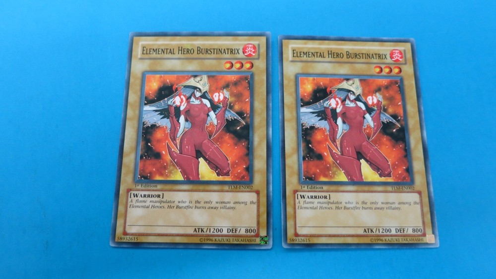 Welcome to Great_Deals_On_Collectibles.We are in the retail hobby sector and have been since 1991.We sell sportscards,gaming cards,comic books,action figures,plush toys and various other hobby related items.We have been on Ebay since 1999.We try to make buyers experience on EBAY as satisfying as possible.Our feedback on Ebay speaks volumes.Every item we have up for auction is LIVE and ready to be shipped upon p2x ayment. If you have any questions feel free to contact us,thanks for showing interest. YUGIOH You are bidding on 2x FIRST 1ST EDITION ELEMENTAL HERO BURNSTINATRIX TLM-EN002 COMMON YUGIOH NM