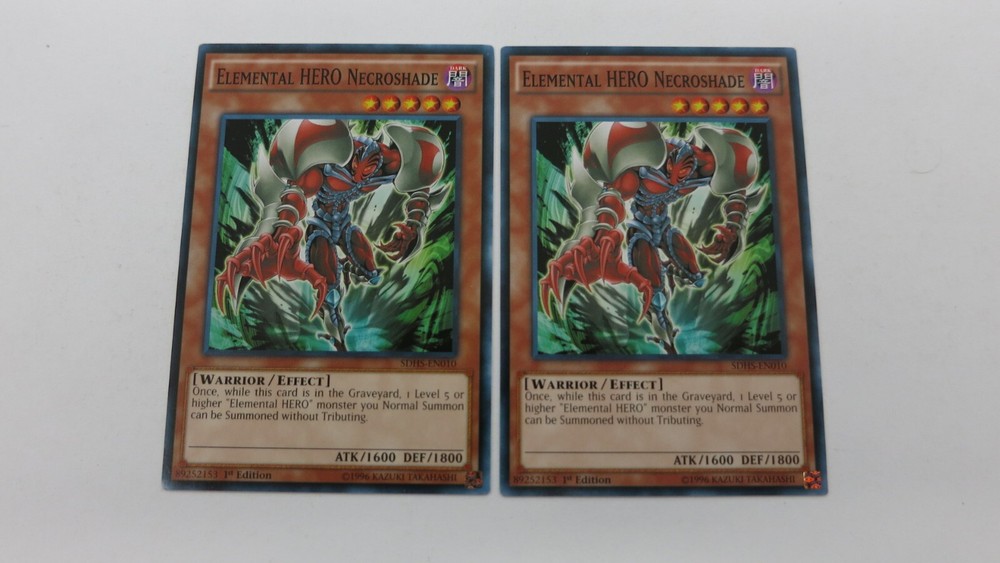 Welcome to Great_Deals_On_Collectibles.We are in the retail hobby sector and have been since 1991.We sell sportscards,gaming cards,comic books,action figures,plush toys and various other hobby related items.We have been on Ebay since 1999.We try to make buyers experience on EBAY as satisfying as possible.Our feedback on Ebay speaks volumes.Every item we have up for auction is LIVE and ready to be shipped upon payment. If you have any questions feel free to contact us,thanks for showing interest. YUGIOH You are bidding on 2x ELEMENTAL HERO NECROSHADE 1ST EDITION SDHS-EN010 COMMON YUGIOH NM / UNPLAYED