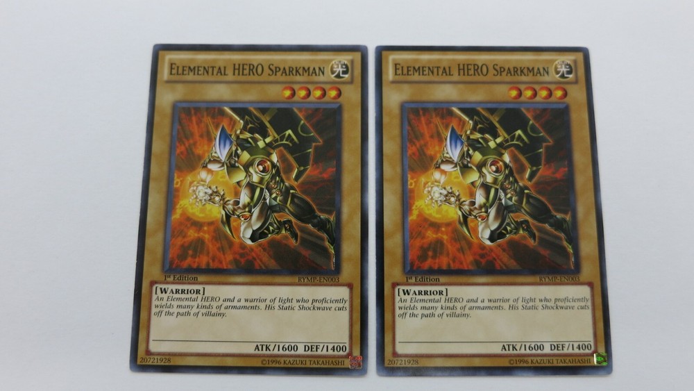 Welcome to Great_Deals_On_Collectibles.We are in the retail hobby sector and have been since 1991.We sell sportscards,gaming cards,comic books,action figures,plush toys and various other hobby related items.We have been on Ebay since 1999.We try to make buyers experience on EBAY as satisfying as possible.Our feedback on Ebay speaks volumes.Every item we have up for auction is LIVE and ready to be shipped upon payment. If you have any questions feel free to contact us,thanks for showing interest. YUGIOH You are bidding on 2x ELEMENTAL HERO SPARKMAN MONSTER 1ST EDITION RYMP-EN003 COMMON YUGIOH NM