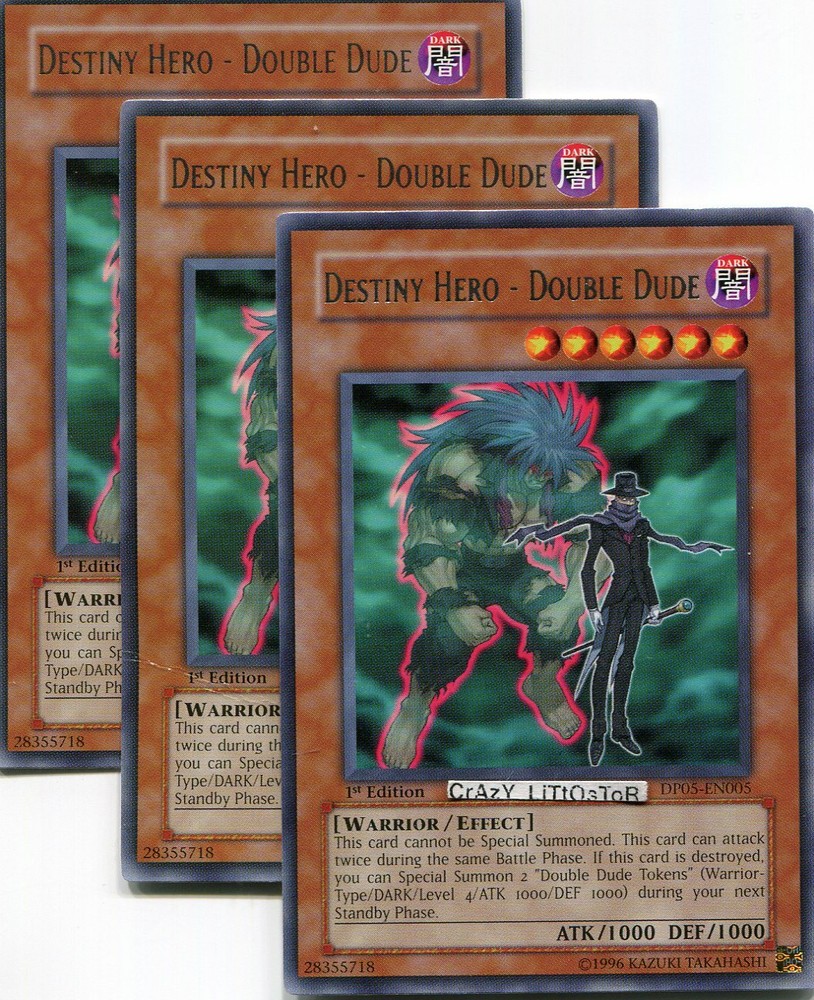 **YU-GI-OH** **3 X DESTINY HERO - DOUBLE DUDE** **SILVER RARE** **1ST EDITION** **NON-HOLOGRAPHIC** **JADEN YUKI DUELIST PACK VOL.5 DP05-EN005** **N/MINT CONDITION** W ELCOME TO CRAZY_LITTOSTORE ! TO MAKE YOUR PURCHASE AS SIMPLE AND EASY AS POSSIBLE, PLEASE REFER TO THE DETAILED STORE POLICIES LISTED BELOW. PLEASE REVIEW OUR TERMS BEFORE BIDDING. PLACING A BID ON OUR AUCTION IS YOUR ACCEPTANCE OF THESE TERMS. WITHIN 48 HOURS OF WINNING AN ITEM IN AUCTION OR COMPLETING A BUY IT NOW PURCHASE, COMPLETE THE CHECK OUT NOW PART OF THE TRANSACTION. WE HAVE UNPAID ASSISTANT TO OPEN OR CLOSE THE CASES ON OUR BEHALF. SO THE SYSTEM WILL BE AUTOMATICALLY OPEN CASES IF THE PAYMENT ISN'T RECEIVED WITHIN 7 DAYS OF THE CLOSE OF THE SALE. THE AUCTION WILL ALSO BE VOIDED AND A NON-PAYING ALERT WILL BE FILED WITH EBAY. WE ACCEPT PAYMENT THROUGH PAYPAL: DUE TO EBAY POLICIES, YOU ARE NOW ONLY HAVE ONE PAYMENT OPTION. CUSTOMER SERVICE: WHY CHOOSE US? OUR CUSTOMERS KNOW THAT WE ARE AN HONEST, TRUSTWORTHY SELLER THAT IS COMMITTED TO SATISFACTION BY PROVIDING HIGH QUALITY PRODUCTS AND STELLAR CUSTOMER SERVICE. CUSTOMER SATISFACTION IS OUR # 1 GOAL! DON'T HESITATE TO CONTACT US WITH ANY QUESTIONS OR CONCERNS. SHIPPING: WE WILL BE SECURELY SHIPPED YOUR ORDER WITH TRACKING CONFIRMATION NUMBER WITHIN 24 HOURS AFTER THE PAYMENT COMPLETED BY PAYPAL SYSTEM (MONDAY THROUGH SATURDAY), IF USED PAYPAL FOR YOUR PAYMENT METHOD. IMPORT DUTIES, TAXES AND CHARGES ARE NOT INCLUDED IN THE ITEM PRICE OR SHIPPING FEES. THESE CHARGES ARE THE BUYER RESPONSIBILITY. PLEASE CHECK WITH YOUR COUNTRY'S CUSTOMS OFFICE TO DETERMINE FOR WHAT THESE ADDITIONAL COSTS WILL BE PRIOR TO YOUR BIDDING/BUYING. THESE CHARGES ARE NORMALLY COLLECTED BY THE DELIVERY FREIGHT (SHIPPING) COMPANY OR WHEN YOU PICK UP THE ITEM. PLEASE DO NOT CONFUSE THEM FOR ADDITIONAL SHIPPING CHARGES. WE DO NOT MARK MERCHANDISE VALUES BELOW ITS VALUE OR MARK ITEMS AS "GIFTS". US AND INTERNATIONAL GOVERNMENT REGULATIONS HAS PROHIBITED SUCH BEHAVIOR. USPS FIRST CLASS MAIL = $2.61 =========>>>>> INT'L USPS FIRST CLASS = $13.05 USPS PRIORITY MAIL = $4.95 ==========>>>> INT'L PRIORITY MAIL = $28.95 USPS EXPRESS MAIL = $18.95 ===========>>>> INT'L EXPRESS MAIL = $45.95 WE WILL COMBINE SHIPPING FOR MULTIPLE PURCHASE $.50 EACH ADDITIONAL ITEM.... RETURNS: ITEMS THAT ARE SOLD ARE GUARANTEED AGAINST DOA (DEAD-ON ARRIVAL). IT IS THE BUYER'S RESPONSIBILITY TO CONTACT US BY E-MAIL WITHIN 48 HOURS OF PRODUCTS DELIVERY IF AN ITEM IS DEFECTIVE. OTHERWISE, THE DOA GUARANTEE EXPIRES. PRODUCTS CANNOT BE RETURNED OF REASONS OTHER THAN DEFECTIVENESS. YOUR MONEY WILL BE GLADLY REFUNDED IF RETURNED IN ORIGINAL CONDITION. BUYER IS RESPONSIBLE FOR ALL SHIPPING CHARGES OF RETURN ITEMS AND SHIPPING CHARGES ARE NON-REFUNDABLE. THIS RETURN POLICIES DOES NOT APPLY TO AUTOMOBILES. DON'T MISS OUT ON THIS GREAT DEAL! DON'T HESITATE......... BID NOW !!! THANKS FOR BIDDING AND GOOD LUCK !!!!