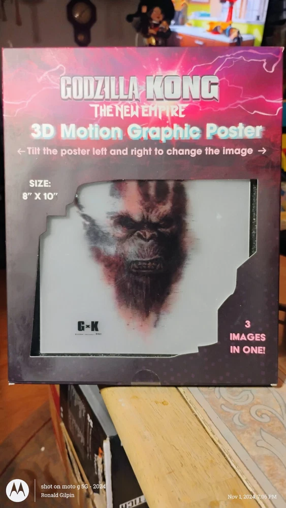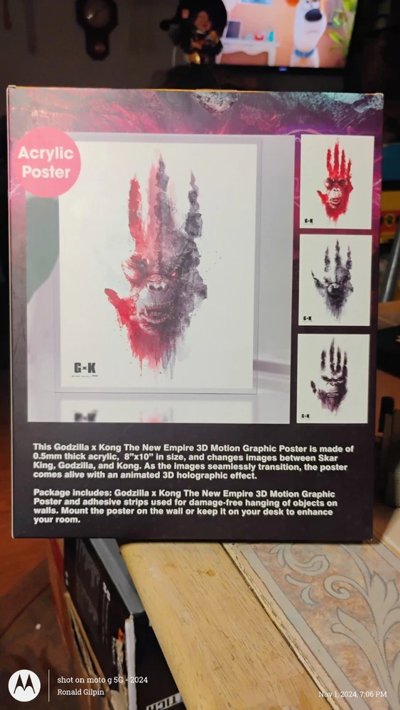 This unique 3D motion graphic poster by Otaku is a must-have for fans of the Godzilla x Kong movie. Measuring 8x10 in size, this poster features a stunning image of the iconic movie monster in its handprint. The poster is personalized with instructions on how to change the image by tilting it to the left or right. This item is perfect for collectors of movie memorabilia and entertainment enthusiasts. It is an original United States poster from the 2000-Now era and comes with a California Prop 65 Warning. The poster is perfect for those who want to add a touch of personalization to their home or office.