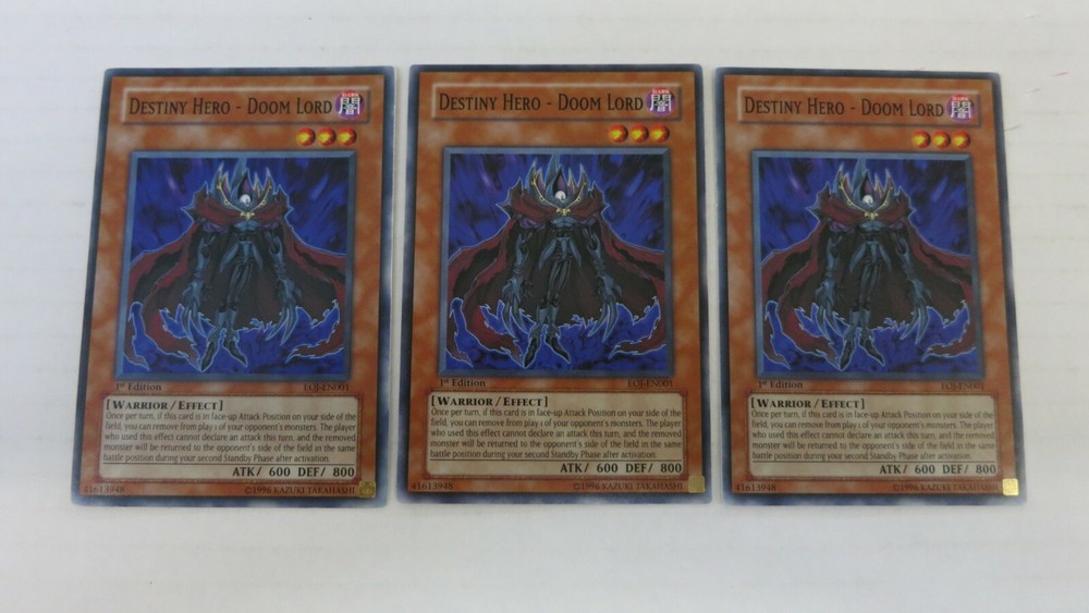 Welcome to Great_Deals_On_Collectibles.We are in the retail hobby sector and have been since 1991.We sell sportscards,gaming cards,comic books,action figures,plush toys and various other hobby related items.We have been on Ebay since 1999.We try to make buyers experience on EBAY as satisfying as possible.Our feedback on Ebay speaks volumes.Every item we have up for auction is LIVE and ready to be shipped upon payment. If you have any questions feel free to contact us,thanks for showing interest. YUGIOH You are bidding on 3x DESTINY HERO DOOM LORD 1ST EDITION EOJ-EN001 COMMON YUGIOH NM / UNPLAYED