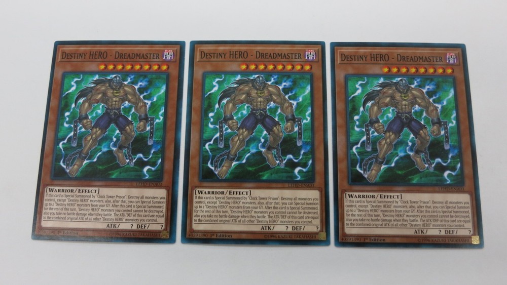 Welcome to Great_Deals_On_Collectibles.We are in the retail hobby sector and have been since 1991.We sell sportscards,gaming cards,comic books,action figures,plush toys and various other hobby related items.We have been on Ebay since 1999.We try to make buyers experience on EBAY as satisfying as possible.Our feedback on Ebay speaks volumes.Every item we have up for auction is LIVE and ready to be shipped upon payment. If you have any questions feel free to contact us,thanks for showing interest. YUGIOH You are bidding on 3x DESTINY HERO DREADMASTER LEHD-ENA03 1ST EDITION COMMON YUGIOH NM UNPLAYED