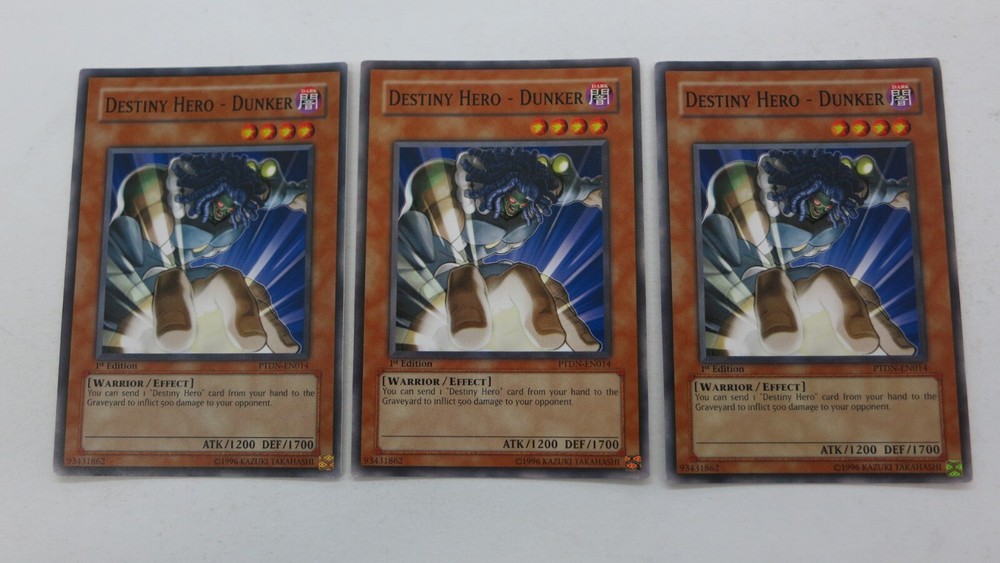 Welcome to Great_Deals_On_Collectibles.We are in the retail hobby sector and have been since 1991.We sell sportscards,gaming cards,comic books,action figures,plush toys and various other hobby related items.We have been on Ebay since 1999.We try to make buyers experience on EBAY as satisfying as possible.Our feedback on Ebay speaks volumes.Every item we have up for auction is LIVE and ready to be shipped upon payment. If you have any questions feel free to contact us,thanks for showing interest. YUGIOH You are bidding on 3x DESTINY HERO DUNKER 1ST EDITION PTDN-EN014 COMMON YUGIOH NM / UNPLAYED