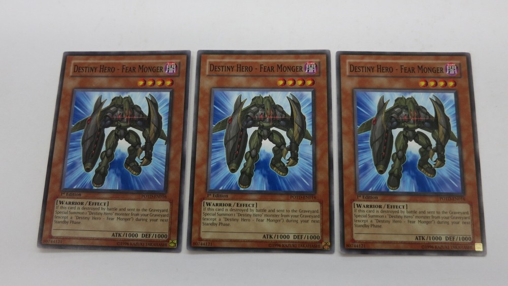Welcome to Great_Deals_On_Collectibles.We are in the retail hobby sector and have been since 1991.We sell sportscards,gaming cards,comic books,action figures,plush toys and various other hobby related items.We have been on Ebay since 1999.We try to make buyers experience on EBAY as satisfying as possible.Our feedback on Ebay speaks volumes.Every item we have up for auction is LIVE and ready to be shipped upon payment. If you have any questions feel free to contact us,thanks for showing interest. YUGIOH You are bidding on 3x DESTINY HERO FEAR MONGER 1ST EDITION POTD-EN016 COMMON YUGIOH NM / UNPLAYED