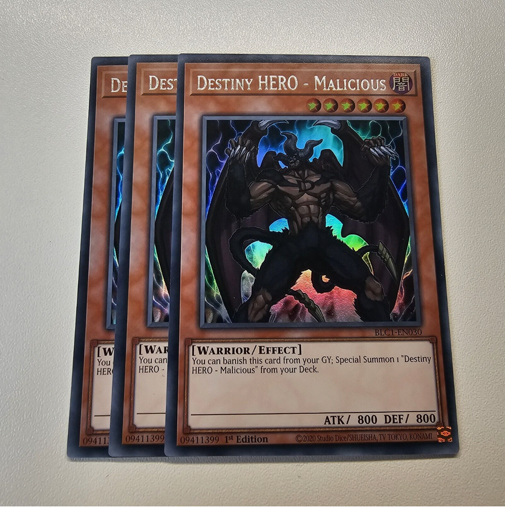 This playset of Destiny Hero Malicious is awesome! The cards arrived in perfect condition, exactly as described, and the seller shipped them super fast. Great price for a competitive staple—highly recommended for any Yu-Gi-Oh! player looking to boost their deck. The seller is super reliable and offers combined postage, which is a nice bonus. Will definitely buy from Grandpa’s Card Corner again!