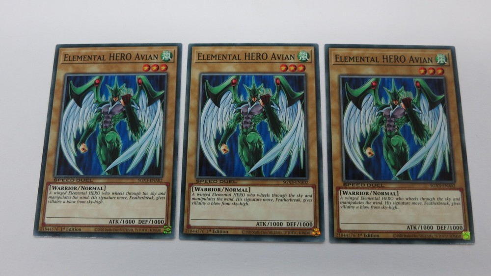 Welcome to Great_Deals_On_Collectibles.We are in the retail hobby sector and have been since 1991.We sell sportscards,gaming cards,comic books,action figures,plush toys and various other hobby related items.We have been on Ebay since 1999.We try to make buyers experience on EBAY as satisfying as possible.Our feedback on Ebay speaks volumes.Every item we have up for auction is LIVE and ready to be shipped upon payment. If you have any questions feel free to contact us,thanks for showing interest. YUGIOH You are bidding on 3x ELEMENTAL HERO AVIAN 1ST EDITION SGX3-ENA02 COMMON YUGIOH NM / UNPLAYED
