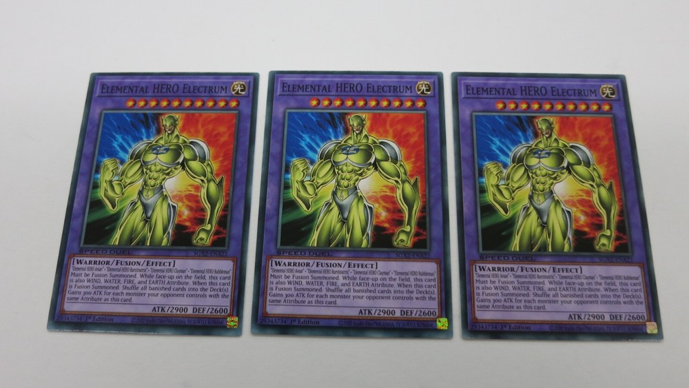 Welcome to Great_Deals_On_Collectibles.We are in the retail hobby sector and have been since 1991.We sell sportscards,gaming cards,comic books,action figures,plush toys and various other hobby related items.We have been on Ebay since 1999.We try to make buyers experience on EBAY as satisfying as possible.Our feedback on Ebay speaks volumes.Every item we have up for auction is LIVE and ready to be shipped upon payment. If you have any questions feel free to contact us,thanks for showing interest. YUGIOH You are bidding on 3x ELEMENTAL HERO ELECTRUM FUSION SGX2-ENA22 COMMON YUGIOH NM UNPLAYED