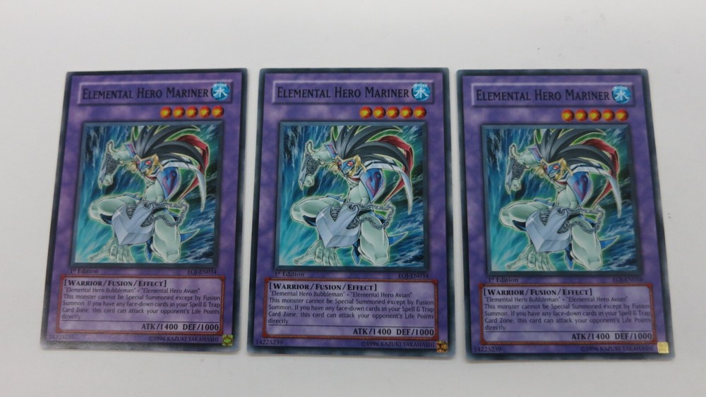 Welcome to Great_Deals_On_Collectibles.We are in the retail hobby sector and have been since 1991.We sell sportscards,gaming cards,comic books,action figures,plush toys and various other hobby related items.We have been on Ebay since 1999.We try to make buyers experience on EBAY as satisfying as possible.Our feedback on Ebay speaks volumes.Every item we have up for auction is LIVE and ready to be shipped upon payment. If you have any questions feel free to contact us,thanks for showing interest. YUGIOH You are bidding on 3x ELEMENTAL HERO MARINER FUSION EOJ-EN034 1ST EDITION COMMON YUGIOH NM