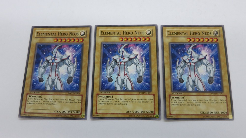 Welcome to Great_Deals_On_Collectibles.We are in the retail hobby sector and have been since 1991.We sell sportscards,gaming cards,comic books,action figures,plush toys and various other hobby related items.We have been on Ebay since 1999.We try to make buyers experience on EBAY as satisfying as possible.Our feedback on Ebay speaks volumes.Every item we have up for auction is LIVE and ready to be shipped upon payment. If you have any questions feel free to contact us,thanks for showing interest. YUGIOH You are bidding on 3x ELEMENTAL HERO NEOS 1ST EDITION POTD-EN001 COMMON YUGIOH NM / UNPLAYED