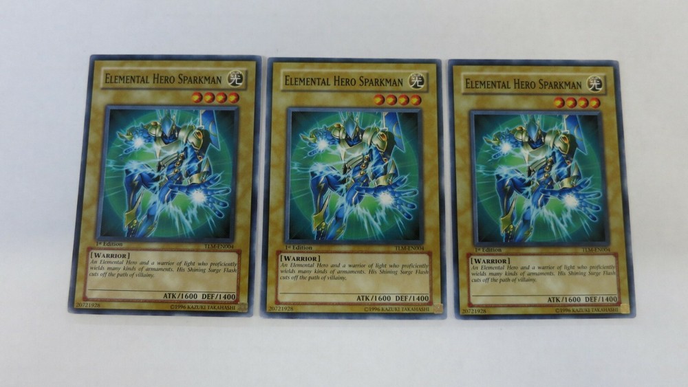 Welcome to Great_Deals_On_Collectibles.We are in the retail hobby sector and have been since 1991.We sell sportscards,gaming cards,comic books,action figures,plush toys and various other hobby related items.We have been on Ebay since 1999.We try to make buyers experience on EBAY as satisfying as possible.Our feedback on Ebay speaks volumes.Every item we have up for auction is LIVE and ready to be shipped upon payment. If you have any questions feel free to contact us,thanks for showing interest. YUGIOH You are bidding on 3x FIRST 1ST EDITION ELEMENTAL HERO SPARKMAN TLM-EN004 PLAYSET COMMON YUGIOH NM