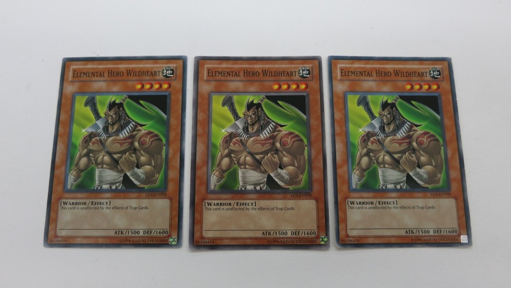 Welcome to Great_Deals_On_Collectibles.We are in the retail hobby sector and have been since 1991.We sell sportscards,gaming cards,comic books,action figures,plush toys and various other hobby related items.We have been on Ebay since 1999.We try to make buyers experience on EBAY as satisfying as possible.Our feedback on Ebay speaks volumes.Every item we have up for auction is LIVE and ready to be shipped upon payment. If you have any questions feel free to contact us,thanks for showing interest. YUGIOH You are bidding on 3x ELEMENTAL HERO WILDHEART UNLIMITED EDITION EEN-EN008 COMMON YUGIOH NM