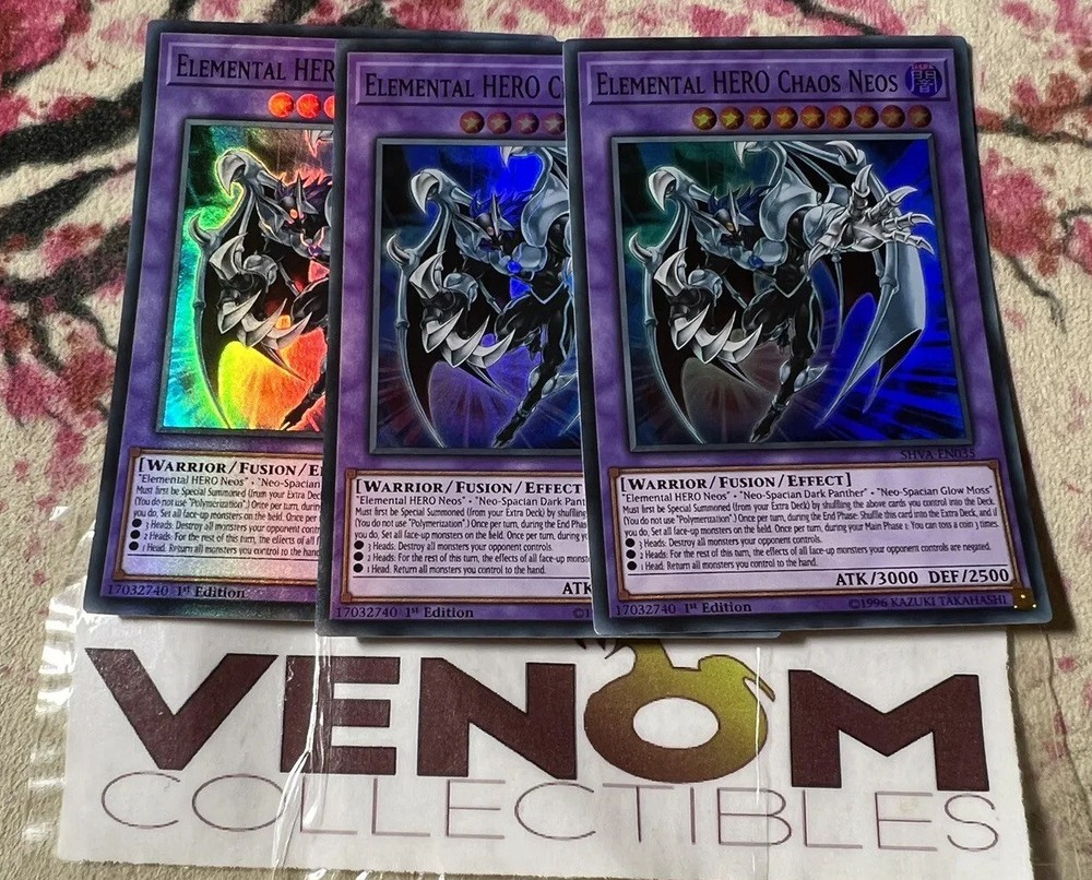 You are buying, exactly as pictured, a playset of EURO Elemental HERO Chaos Neos NM....