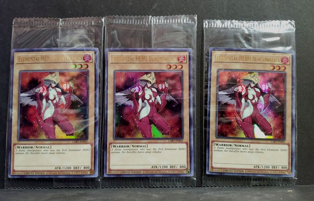 You are Purchasing 3x : YuGiOh ELEMENTAL HERO BURSTINATRIX LART-EN041 Card is New and Never played. SHIPPING & HANDLING Shipping to the UNITED STATES: $3.99US - Tracking & Insurance Shipping Shipping within CANADA $9.99US - Tracking & Insurance Shipping ********************************************************************************************** **Canadian Shipping Times are from 5 -10 Business days depending on location and distance. We will always leave positive feedback for you, and we ask if you can do the same for us. If there is any reason why the transaction was not up to your expectations, please message us before leaving feedback so we can address the issue. ******************************************************************************************* Thank You.