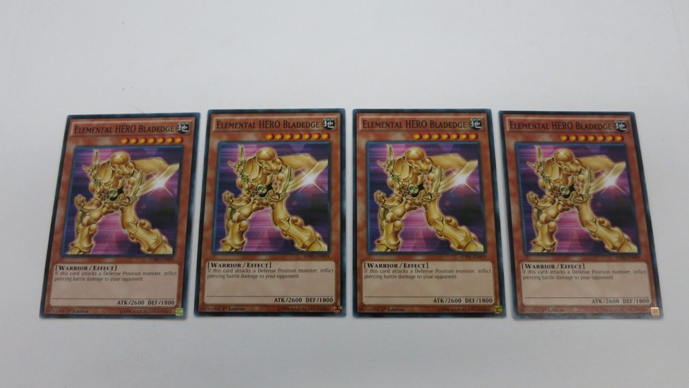 Welcome to Great_Deals_On_Collectibles.We are in the retail hobby sector and have been since 1991.We sell sportscards,gaming cards,comic books,action figures,plush toys and various other hobby related items.We have been on Ebay since 1999.We try to make buyers experience on EBAY as satisfying as possible.Our feedback on Ebay speaks volumes.Every item we have up for auction is LIVE and ready to be shipped upon payment. If you have any questions feel free to contact us,thanks for showing interest. YUGIOH You are bidding on 4x ELEMENTAL HERO BLADEDGE SDHS-EN009 1ST EDITION COMMON YUGIOH NM / UNPLAYED