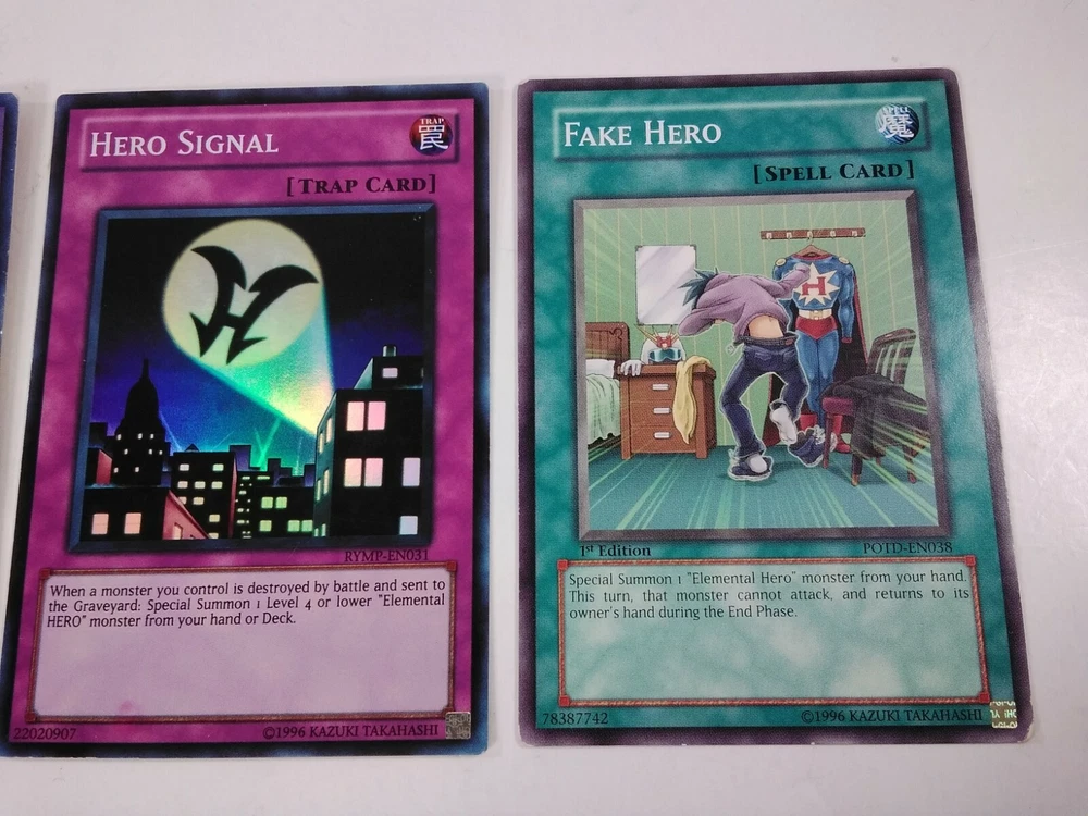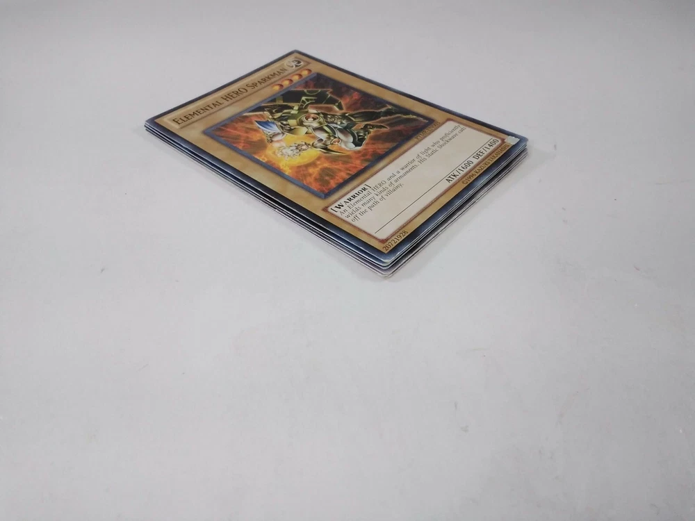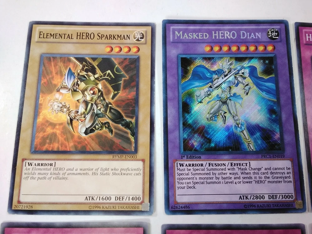 A lot including 6 Elemental HERO YuGiOh cards: Elemental Hero Sparksman - Common Masked Hero Dian - Secret Rare - 1st Edition Hero Signal - Super Rare Change of Hero Reflector Ray Common (x2) Fake Hero - Common - 1st Edition The card are in good condition with some wear to the edges.