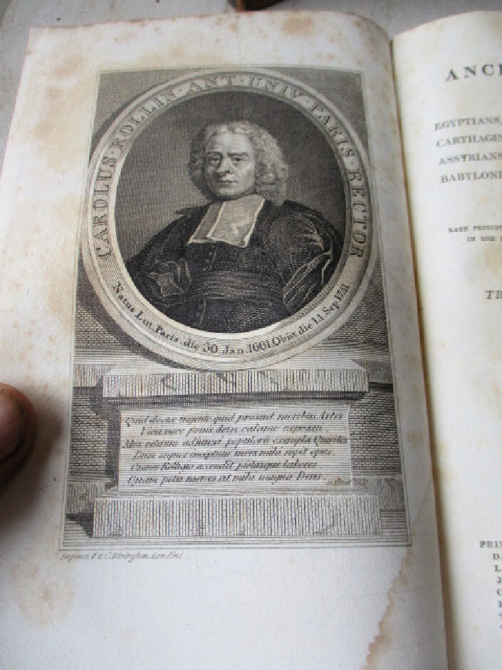 t1126. Complete title is: The Ancient History of The Egyptians, Carthaginians, Assyrians, Babylonians, Medes & Persians, Macedonians and Grecians". 8 Volumes by M.Rollin, translated from French. Printed for F.C. & J.Rivington et al., London, 1817., 13th Editions. Books are octavo, full tan leather.....survivors of old house fire and several covers are loose and spines damaged. Vol. 4 is lacking covers and Vols. 1, 2, 3, 5 with folding pull-out maps. Contents of volumes tight, clean and very bright. Acceptable condition. Do not hesitate to e-mail with any questions. As Always, Satisfaction Guaranteed! I expect to receive payment within 10 days, unless we have made other arrangements. Shipping will be USPS Media mail or Priority, if requested. I'm glad to combine multiple purchases in order to minimize shipping costs. I WILL SHIP INTERNATIONALLY, and I try to be as economical as possible with the shipping costs. RETURN POLICY: Satisfaction Guaranteed! Track Page Views With Auctiva's FREE Counter