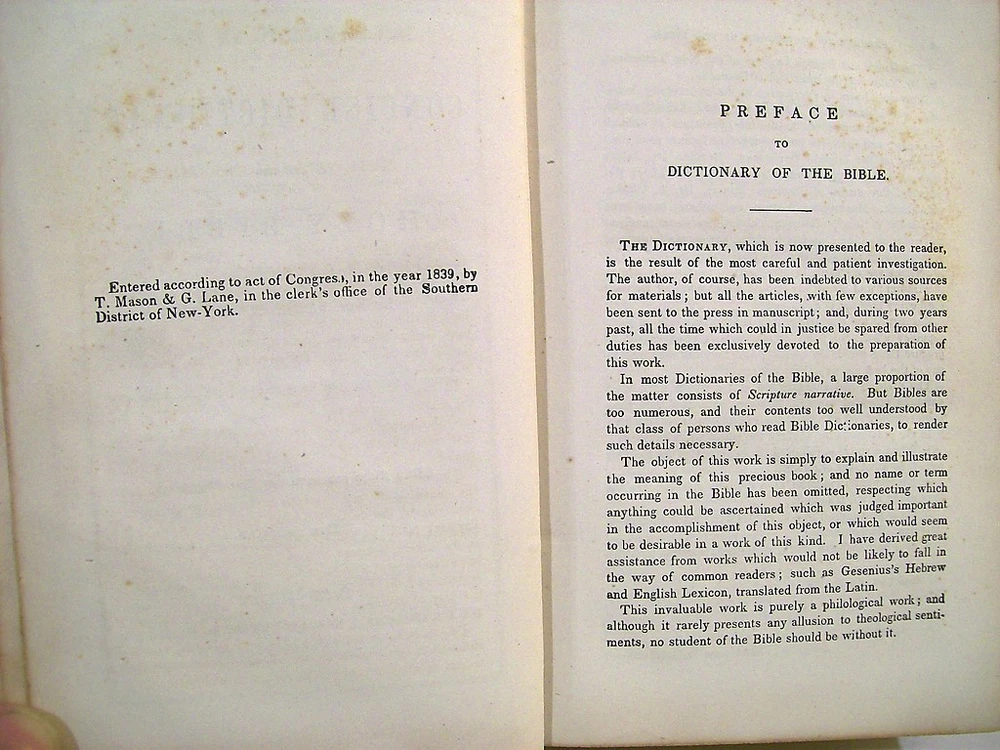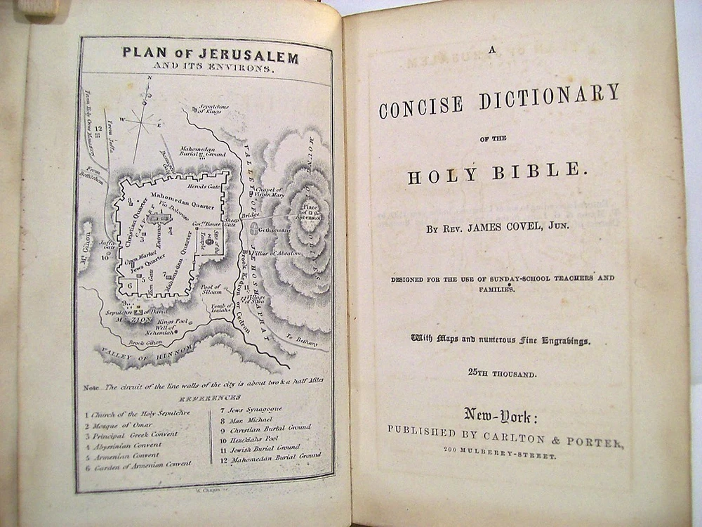 A Concise Dictionary of the Holy Bible by Rev James Covel. Carlton & Porter, New York, 1839. 25 th thousand. Full calf with red spine label lettered in gilt, gilt spine ruling. "Designed for the use of Sunday-school teachers and families." With numerous fine engravings, including frontispiece map plan of Jerusalem and its environs. Sturdy copy of the comprehensive Bible dictionary, arranged alphabetically in double-column format, with numerous engravings and maps, many full page. 536 pages with advertising pages in the back. Hinges are all intact and good. The corners are worn and there is general wear to the leather boards. Internally there is some age discoloration to the endpapers and some very light foxing throughout. There is an old pencil gift inscription on the front end paper. Powered by eBay Turbo Lister The free listing tool. List your items fast and easy and manage your active items.