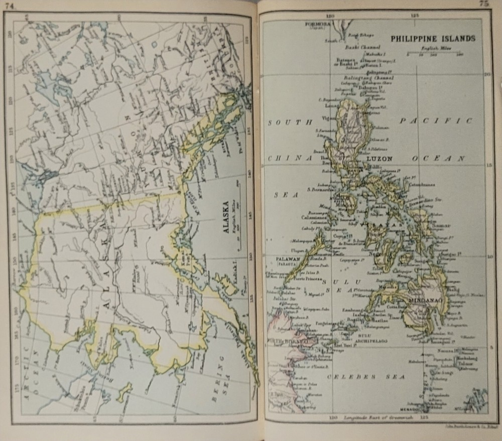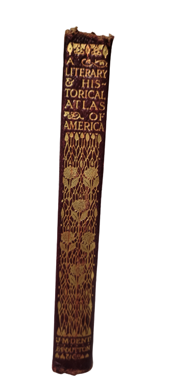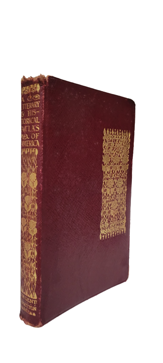 "A LITERARY AND HISTORICAL ATLAS OF AMERICA -- BY J. G. BARTHOLOMEW LL.D. -- LONDON: PUBLISHED BY J M DENT & SONS LTD, AND IN NEW YORK BY E P DUTTON & CO"(UNDATED, CIRCA 1913 TO 1920 PRINTING OF THIS ATTRACTIVE LITTLE HISTORICAL ATLAS OF THE AMERICAS!!)-- an attractive little full limp leather bound copy of this historical atlas and gazetteer of North and South America, with an emphasis on the United States. The book has twenty-seven colored maps as well as numerous black and white illustrations, as well as a gazetteer of cities, towns, and areas. This copy has a bit of fraying to the cover edges and spine ends, mostly just at the top of the spine as shown in my last picture, but otherwise is very good overall condition. THIS IS A FULL LIMP LEATHER BOUND BOOK OF 14 PLUS 96 PLUS 231 PAGES, WHICH MEASURES ABOUT 7 BY 4 AND A HALF INCHES IN DIAMETER