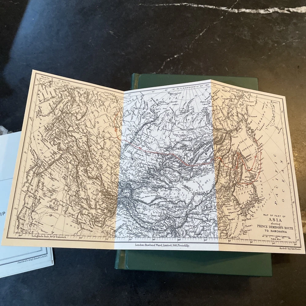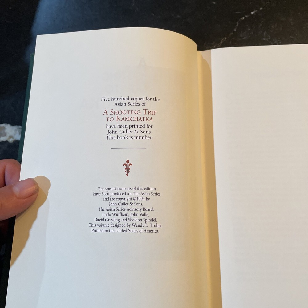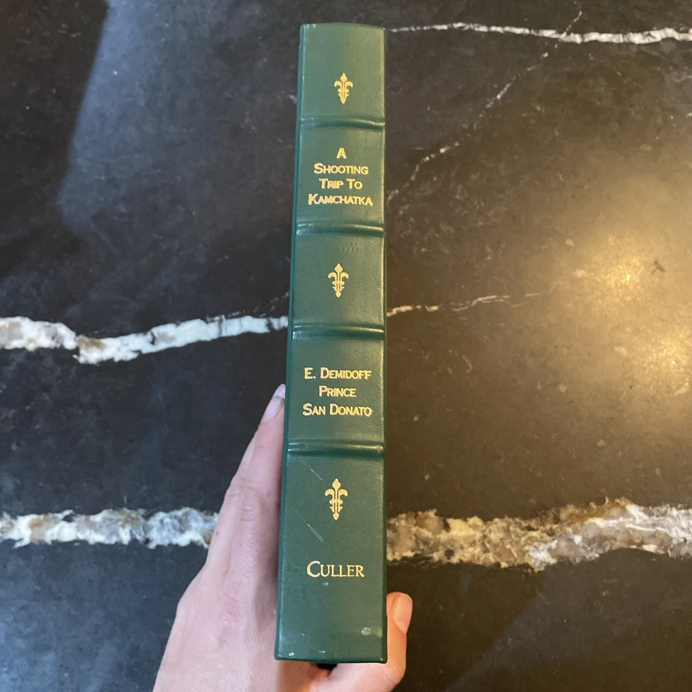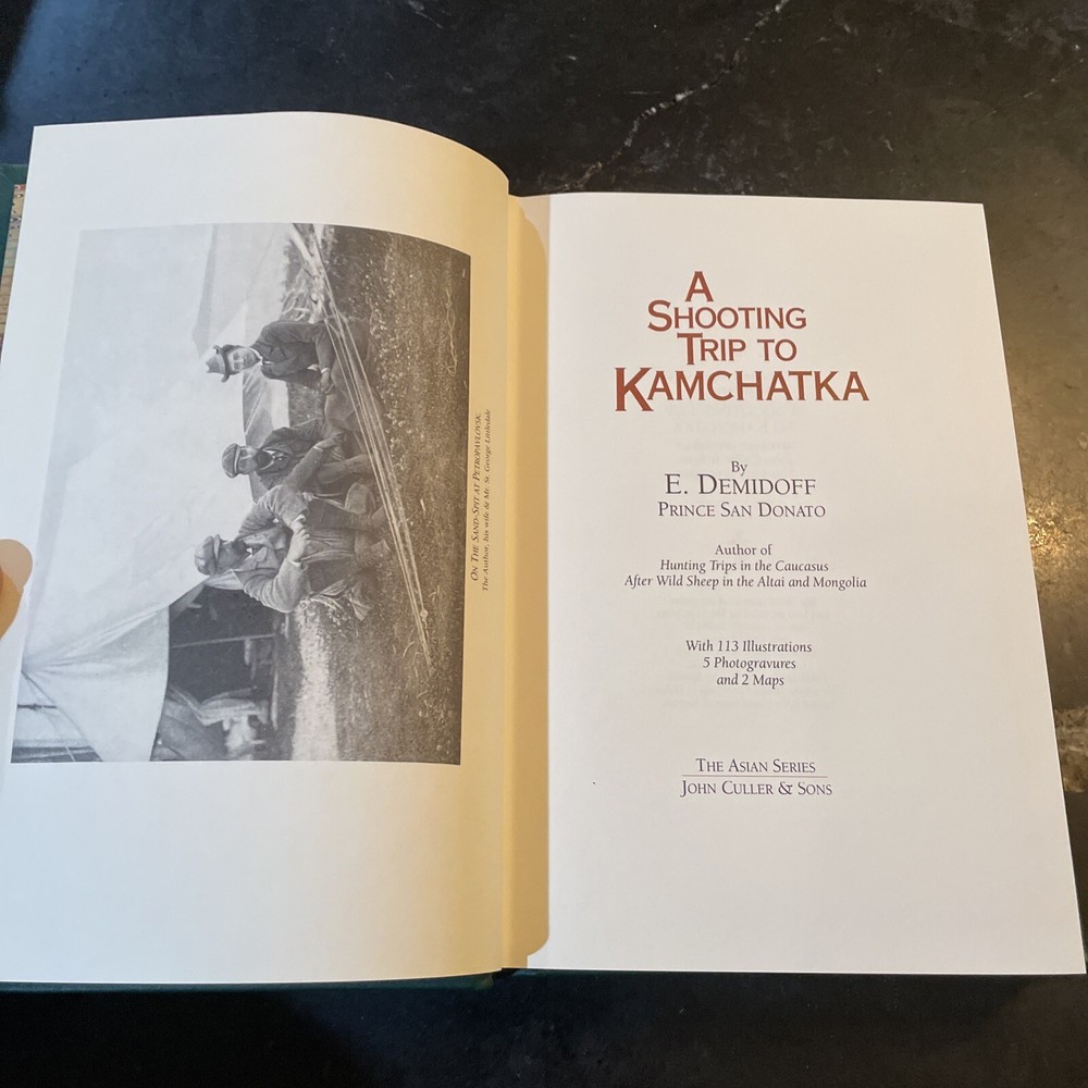 A Shooting Trip to Kamchatka - E. Demidoff - 1994. Published by Culler Press as part of their Asian series in limited run. Green leather with gilt page edges, accents, lettering, and sheep/ram on cover. A beautiful edition of this big game hunting classic. Fold-put maps in pocket at rear, appearing to have never been removed. Cover with a couple very light scuffs. Internally fine. Overall, a quite nice, fine copy. The book is exactly as pictured. Any questions, please ask. Check out our other auctions for related books and ephemera. Thank you, from Haerer Books.