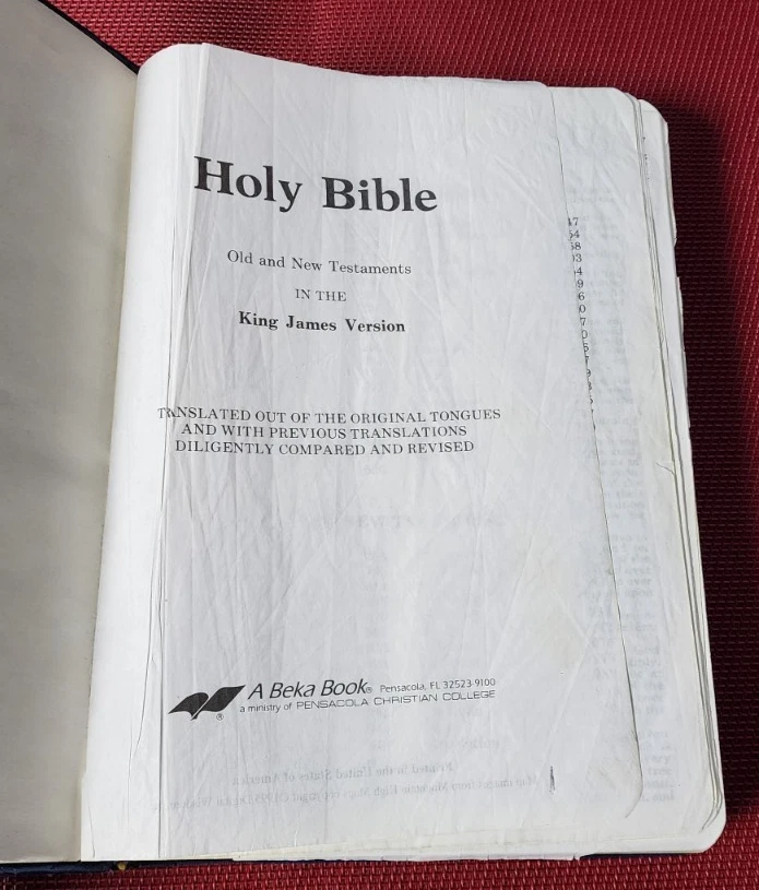 A beka Books Abeka Holy Bible KJV King James Version Blue Cover 1990s Some cover wear. Inside pages good. Some wrinkling, crinkled pages. Minimal to no writing, etc within. Some initial pages in Genesis are ripped but intact. Presentation page is filled out. A well broken in bible - good for speed scriptures drills, competitions, etc.