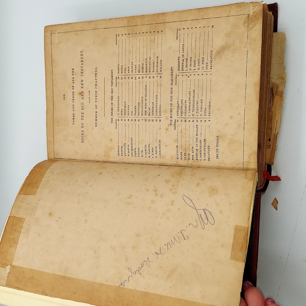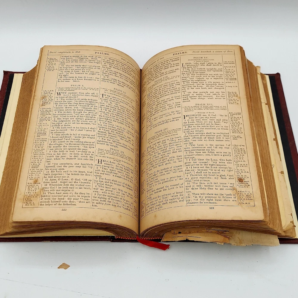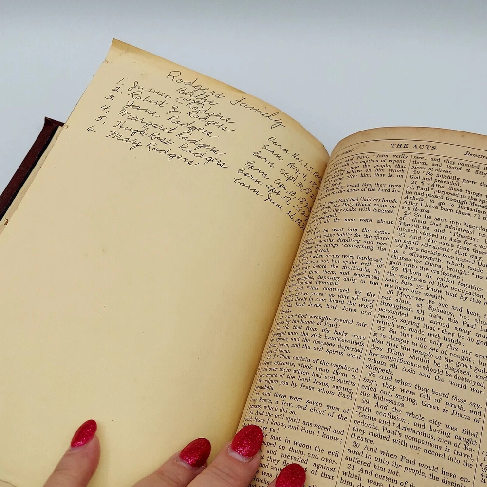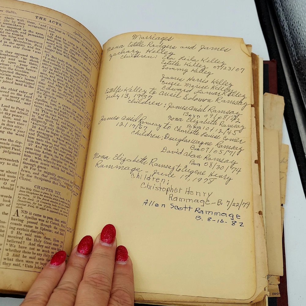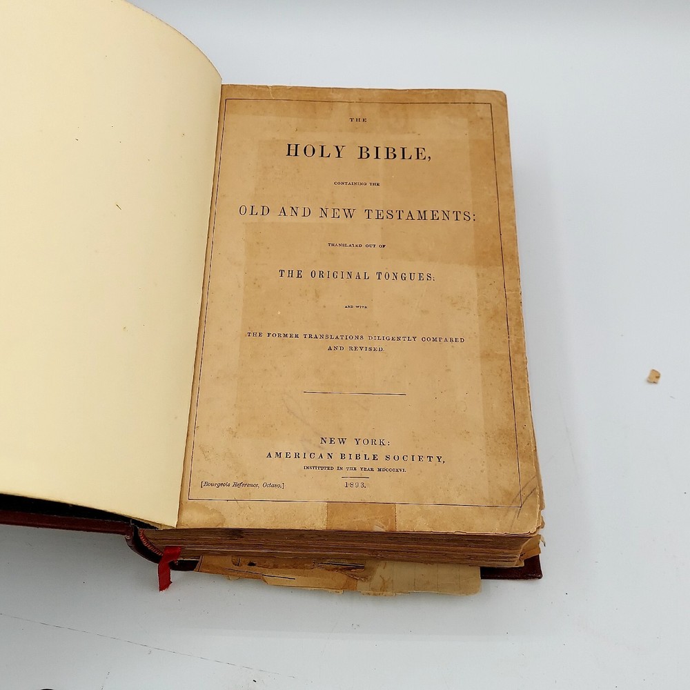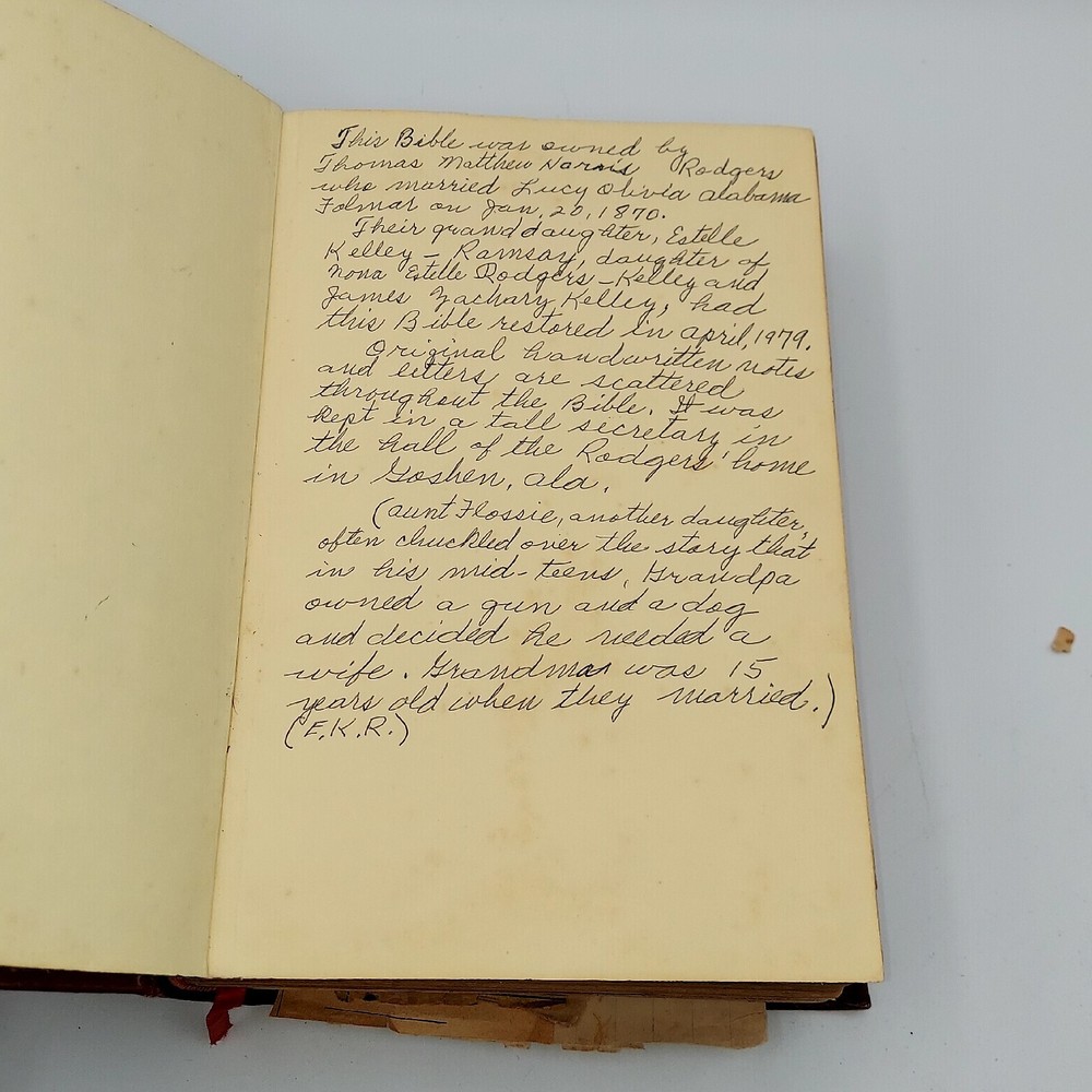 The bible has been rebound front and back covers are not original ( I assume this due to their good condition) one of the front pages has some history of the Bible written in it inner pages - some have light staining, one has a lot of wear and was supported with paper/cardstock ( i have pictured this) some have rips and tears The Bible contains the owners history marriages births ...records dating from 1890 - 1980's, loose letters dating the early 1900s This was an estate sale purchase I asked and there was no family to pass it to which is a shame