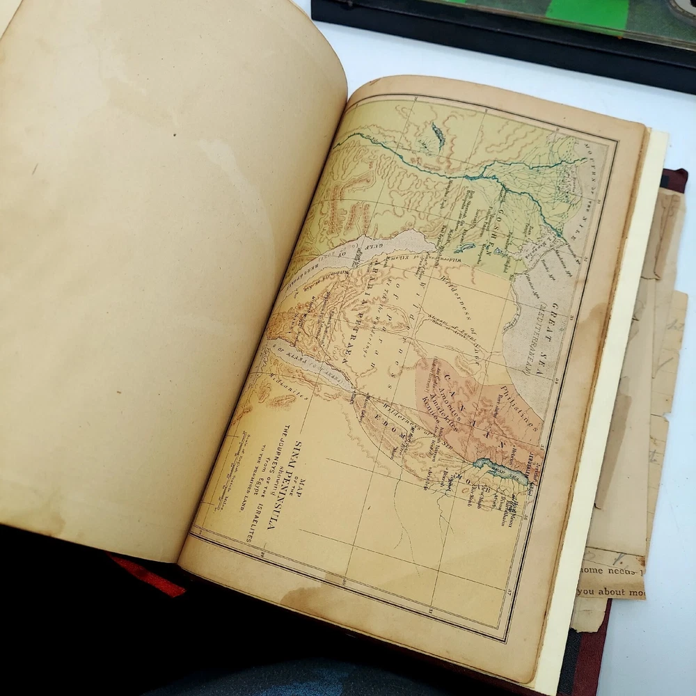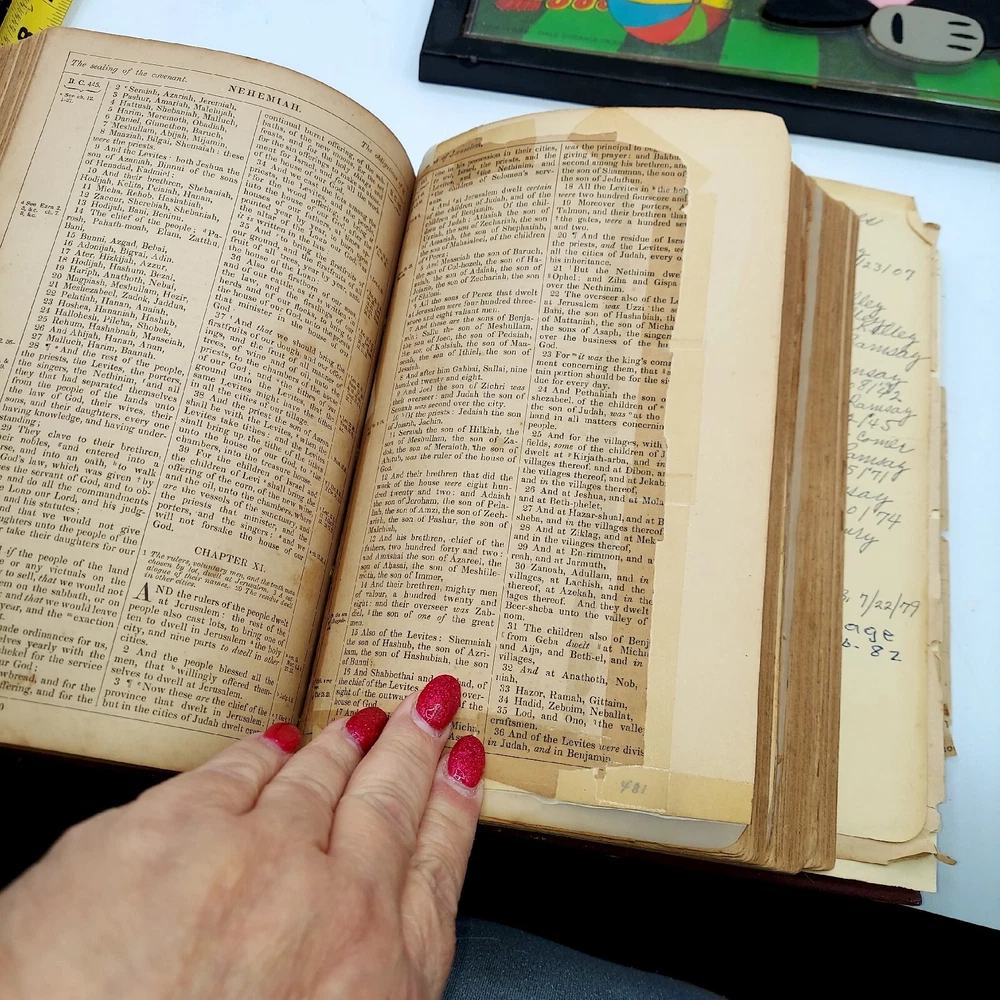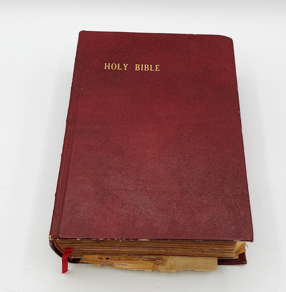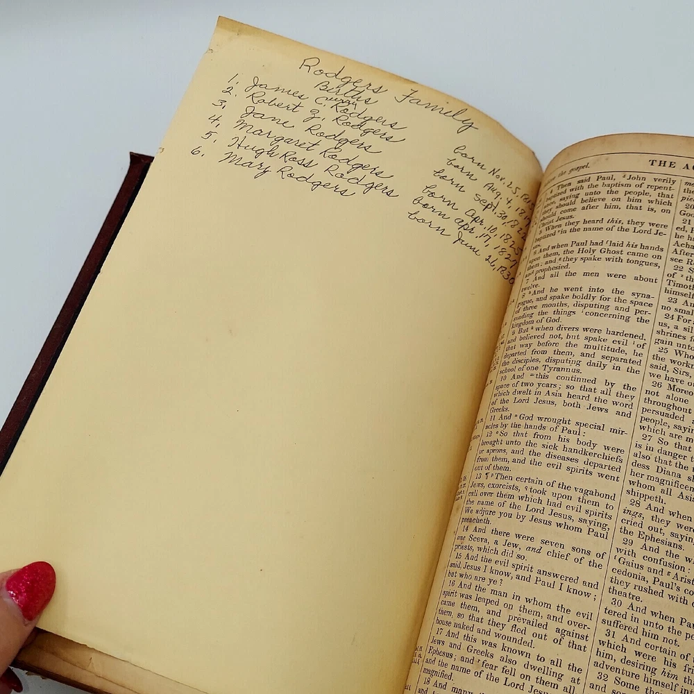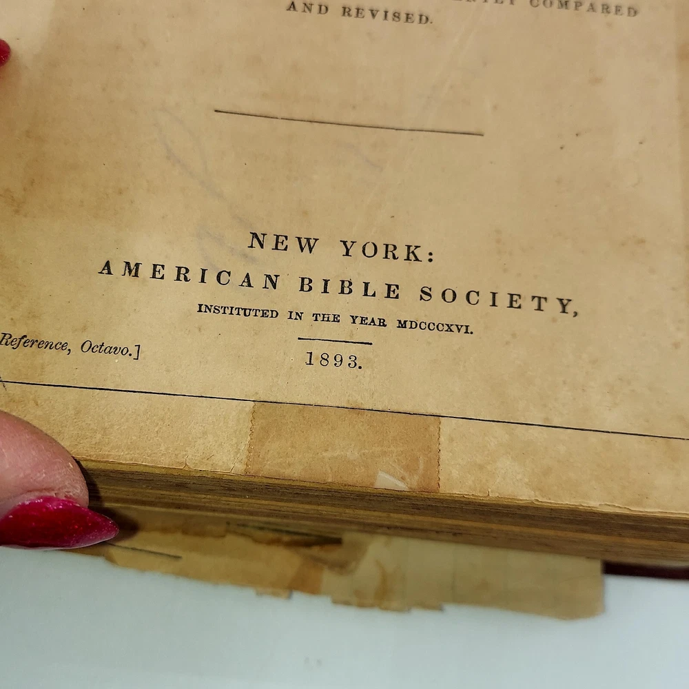 The bible has been rebound front and back covers are not original ( I assume this due to their good condition) one of the front pages has some history of the Bible written in it inner pages - some have light staining, one has a lot of wear and was supported with paper/cardstock ( i have pictured this) some have rips and tears The Bible contains the owners history marriages births ...records dating from 1890 - 1980's, loose letters dating the early 1900s This was an estate sale purchase I asked and there was no family to pass it to which is a shame