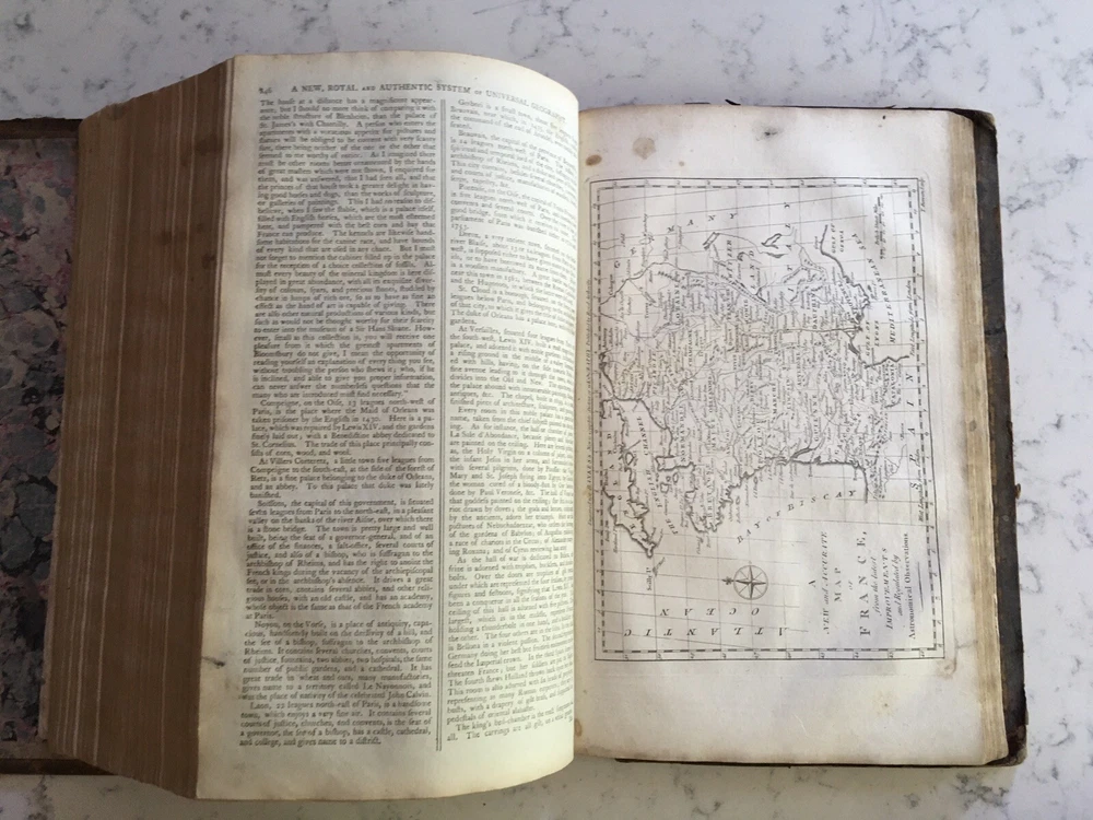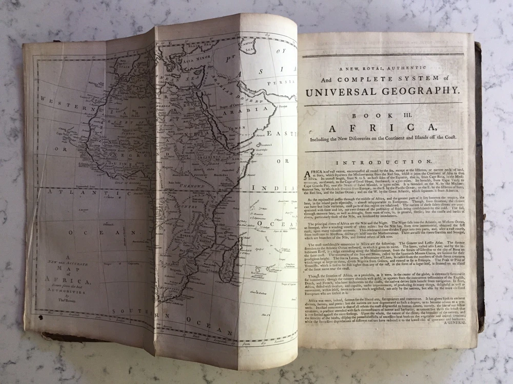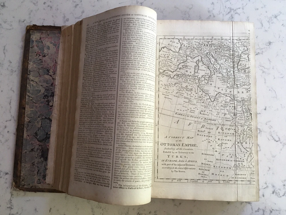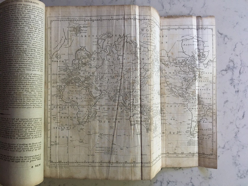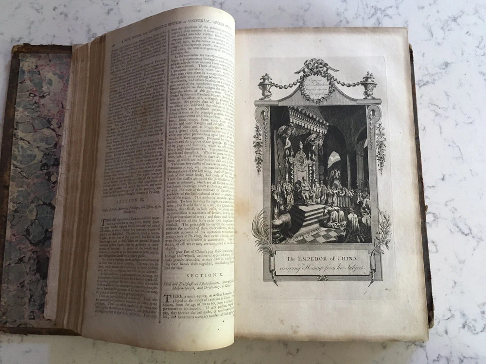 Rev. Thomas Bankes, A New, Royal, and Authentic System of Universal Geography (London: circa 1790) 15.1/4 inches high Missing the following maps and engravings: Pg. 27 - Poulahoo, King of Friendly Islands Pg. 41 Map of Mangea Pg. 93 Terreoboo Bringing Projects to Capt Cook/ Death of Capt Cook Pg. 93 View of Karakooa Bay Pg. 116 Winter Habitations of the Peasants of Kamschatka/ Summer Habitations of Ditto Pg. 116 The Manner in Which the Kamshatka Dry Fish Pg. 257 Various Boats, Barks & Co. used on the Coast of Macabar Pg. 320 Dancing / Hottentot Marriage Pg. 388 Punishingment of a Butcher of Great Cairo Pg. 546 Boats, Barks & Co. used on the Coast of Peru Pg. 584 Habits of the Greenlanders Pg. 685 Russian Dresses- a woman of Livonis Pg. 852 The Port of Marseilles / The Port of Nantes Pg. 892 Map of Italy