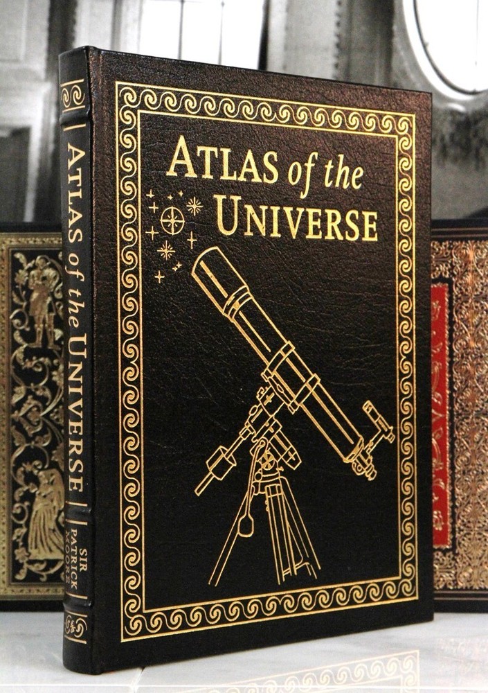 ***Copy of photos, personal formats, graphics, or text is prohibited . Ebay may drop listings with infractions. I review content regularly. Large Coffee Table / Art Books Atlas of the Universe Author: Sir Patrick Moore Illustrations by Description: A normally very scarce title and a nice oversized edition. More than 500 color images, 400 photographs, 70 maps, and 90 artworks. I have tried to mash up a bunch of illustrations just to show you a fraction of what is included in the book. The size of the book and gloss of the pages make this a hard one to photograph without professional equipment. -- Throughout human history, there has been no subject as fascinating and mysterious as the cosmos and our place in it. Atlas of the Universe is a gorgeously illustrated reference to the stars, planets, and beyond. This title is divided into numerous informative and visually stunning sections including: The Universe, The Solar System, The Sun, The Stars, and Star Maps. It includes many references to our endeavor to explore through space missions and even a little on viewing equipment. Just over 12" tall! Condition : Leather is bright with only little sign of shelf wear. Only light marr to gilt page ends for such a large book. The three long patches along the top page ends is from glare of the lights. There is a spot further to the outside, or right of those on the top page ends. Top section of the page ends photo. This Fine Leather Book Features: Top grade, gold embossed/ornamented leather Gilded page ends to protect against dust and moisture Decorative end papers Acid neutral archival paper to last generations