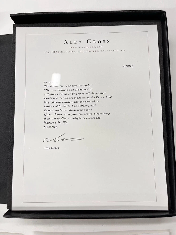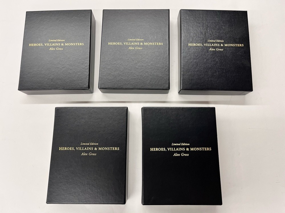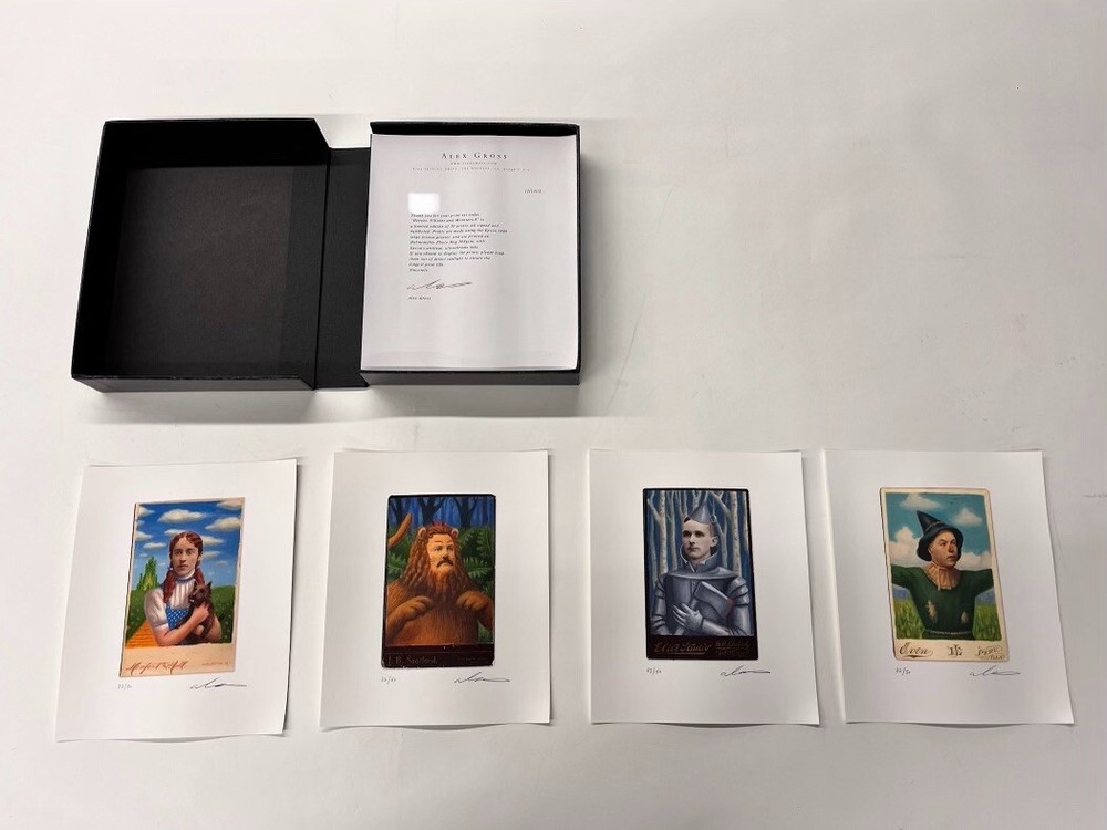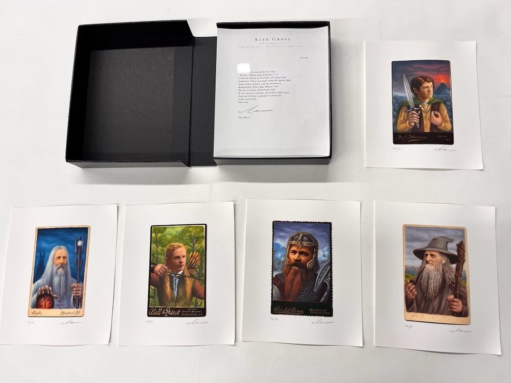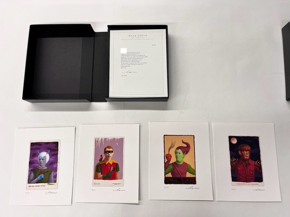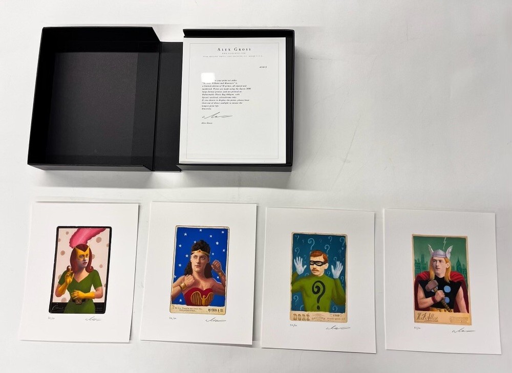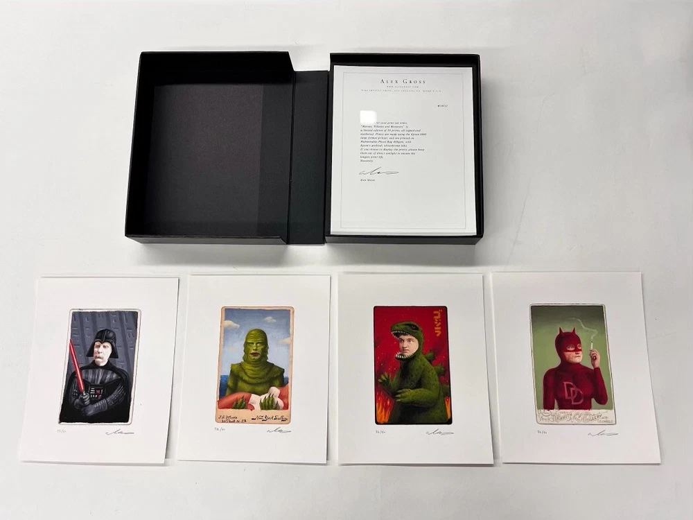 A complete set of all five Alex Gross heroes villains, and monsters print sets. These sets were released between 2012 and 2014. Each comes with a signed letter by Alex Gross explaining how the prints were made. Most sets come with four prints that all have matching numbers 32 out of 50. And there is one set with the Lord of the rings characters that has five prints. These paintings were based on his cabinet card paintings that were subject of the book Transformations. The originals used to make these prints were painted on top of actual cabinet guards from the 1800s. All prints have been stored in the original boxes since they were released. Some prints show some signs of waviness in the paper. This could be due to the liquid in the ink when they were printed but very likely can be flattened if desired. To the best of my knowledge, not all 50 sets of each were made but we can’t say for sure. Please see photos for details and inquire with any questions. Comes from a smoke free home and have been stored out of sunlight in cool conditions for over a decade.
