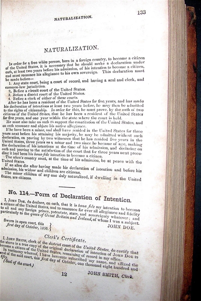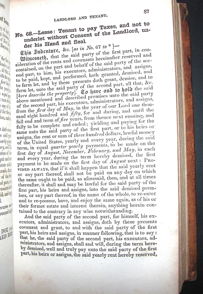 For your considerations is a very good First Edition of The American Lawyer, and Business-Man’s Form-Book by Delos W. Beadle published by Phelps & Fanning in New York, 1851 The book consists of 359 pages plus one page of the publisher’s reviews of the book and includes 32 double page maps (31 States plus the United States). United States laws with forms and instructions are addressed in pages 9 thru 155. Topics include mortgages, deeds, debts, contracts, leases, wills, marriage, business partnerships, oaths of office, naturalization and other legal considerations. A double page map of the United States appears on Pages 342/343. Special Laws of the 31 individual States (as of 1851) are covered in pages 156 through 341 and the Special Laws for each state are preceded by a double page map of the State and each State seal is printed adjacent to the first paragraph of the individual State’s text. Business matters such as United States and Foreign Postage, Bookkeeping and Table of Gold and Silver Coins are covered in pages 344 thru 358. The interior of the book is in very good condition with no markings to the pages. There is some light foxing throughout the book. The book is bound in the original leather and has been professionally rebacked with a new leather label with gilt lettering. A previous owner’s last name (Shelton) is written, in ink, near the top of the front pastedown. A very nice copy of a very collectable title. Thank you,