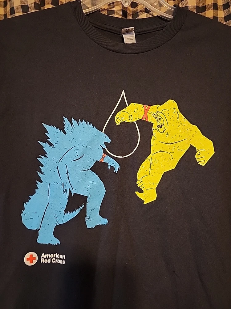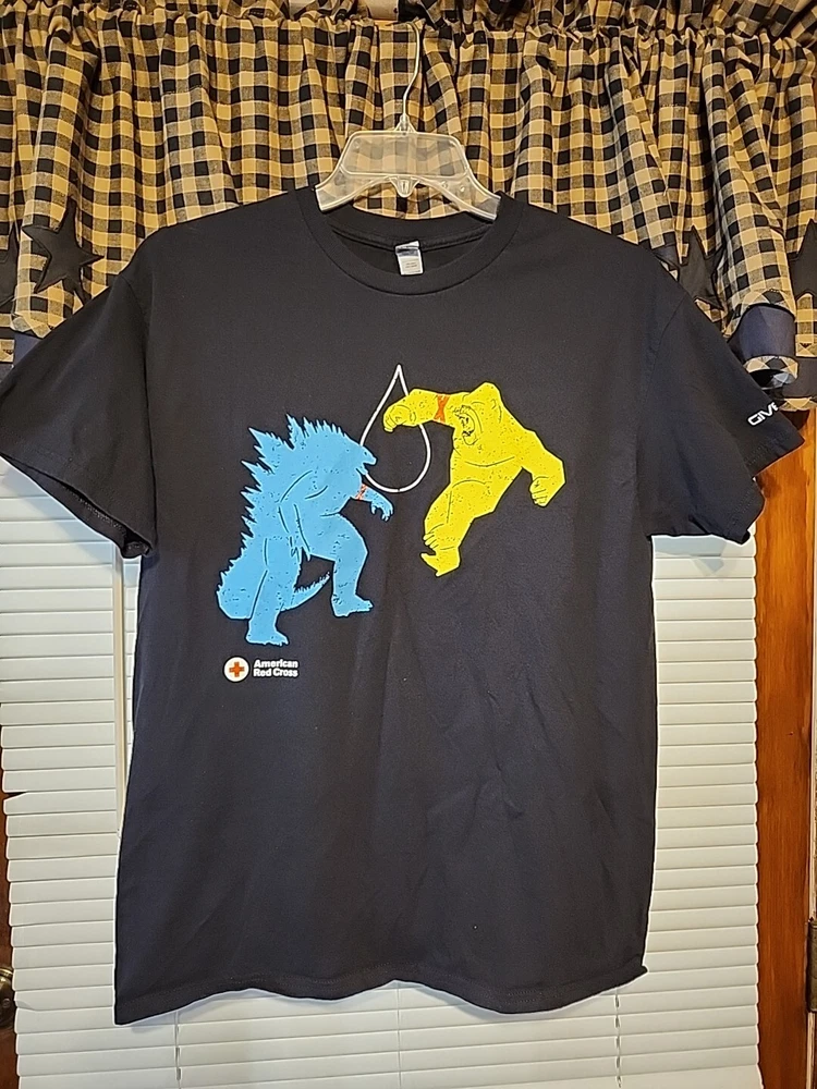 This American Red Cross T-Shirt features a unique graphic print of the iconic movie characters Godzilla and King Kong. The shirt is made of 100% cotton and has short sleeves, a crew neckline, and a regular fit. It is machine washable on a cold/tumble dry low setting. The black color of the shirt is perfect for any occasion and the accents of the graphics and logo add a touch of style. This T-Shirt is unisex and comes in size L. It is part of the Gildan Ultra Cotton product line and was manufactured in the Dominican Republic. The shirt is not vintage and is perfect for anyone who loves movie themes.