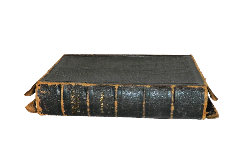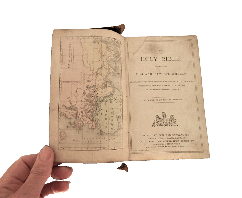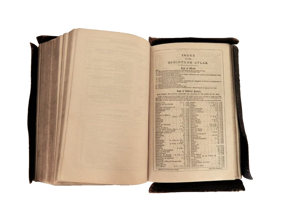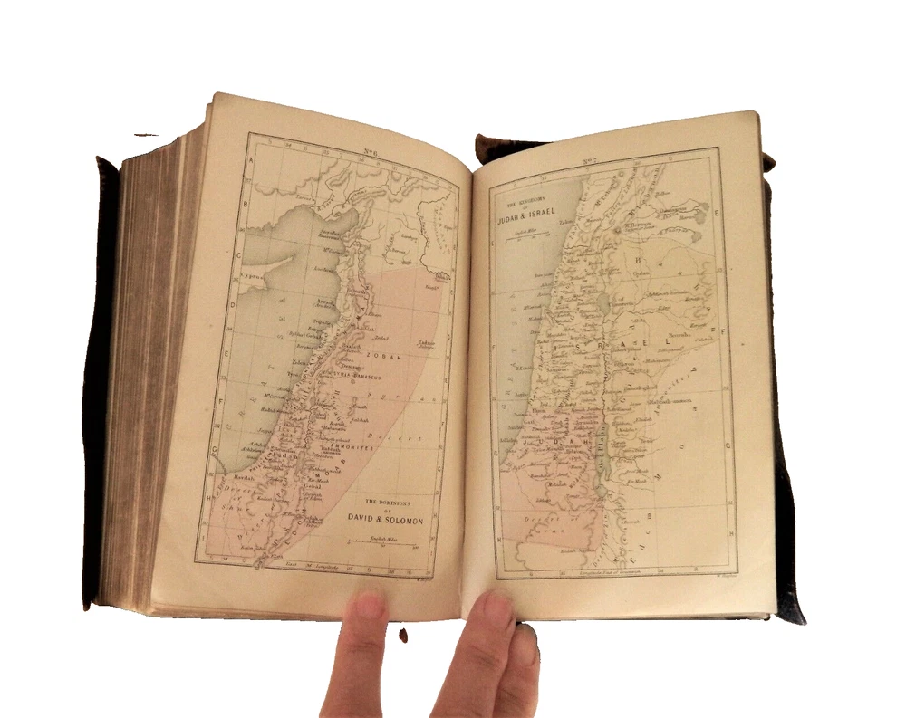 Very interesting collectible antique bible. Presented to my great grandmother in 1894 on her marriage. Gilt edged. Pages intact. Colour map illustrations. Leather jacket worn with age. 4.5 in x 6.5