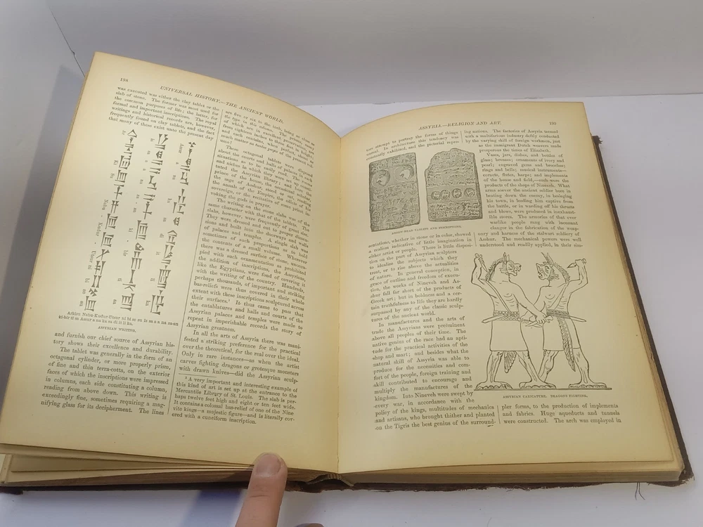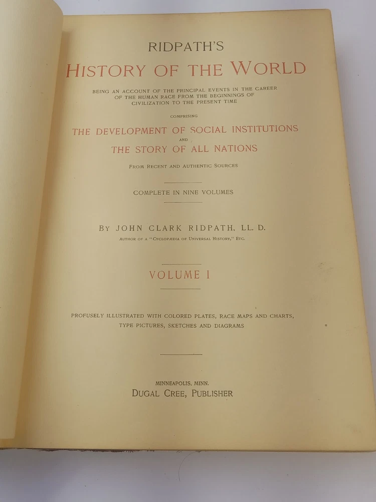 The product is an antique 1901 Ridpath's History of the World Volume I, bound in leather and illustrated. Written by author Ridpath, John Clark, this book was published by Jones Brothers Publishing Company in Cincinnati, Ohio, U.S.A. Focusing on world history, this original print from 1901 provides a unique glimpse into the past with its detailed content and visually captivating maps and illustrations. A valuable addition to any collector's library, this piece of history is a tangible reminder of our shared global heritage.