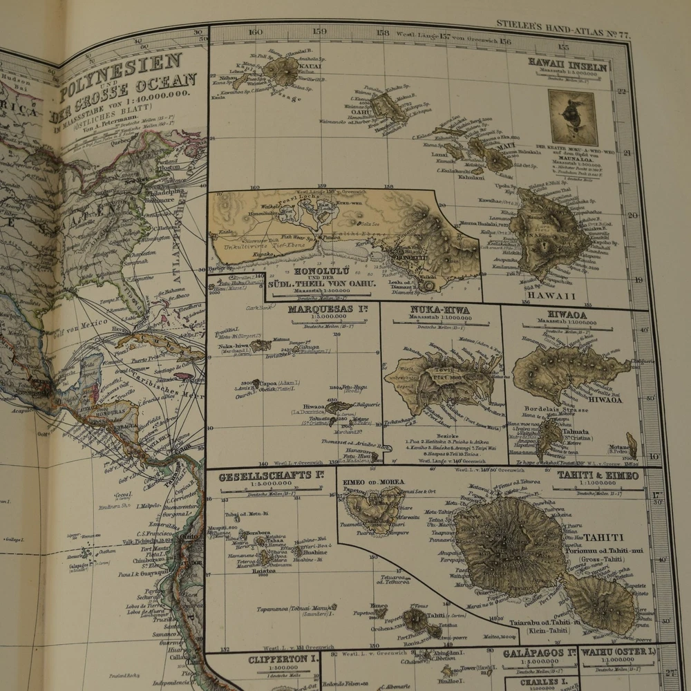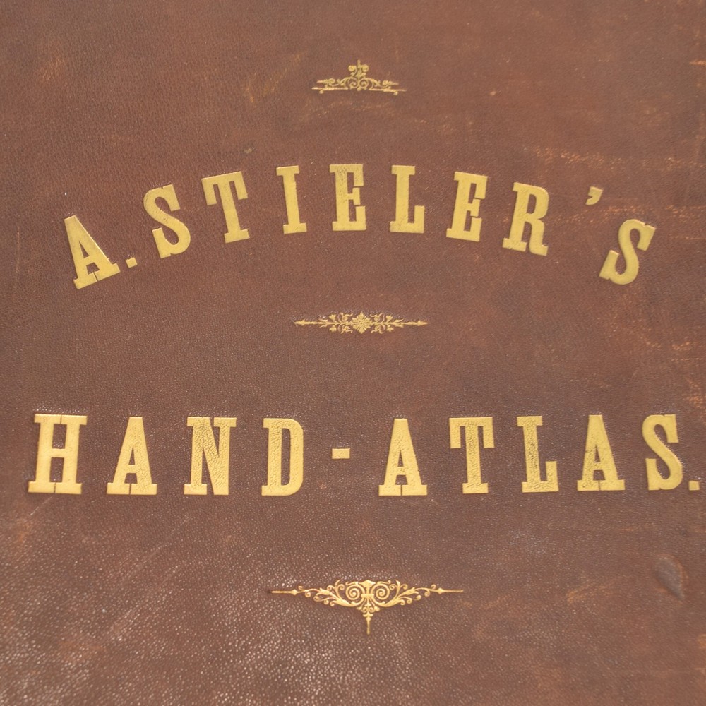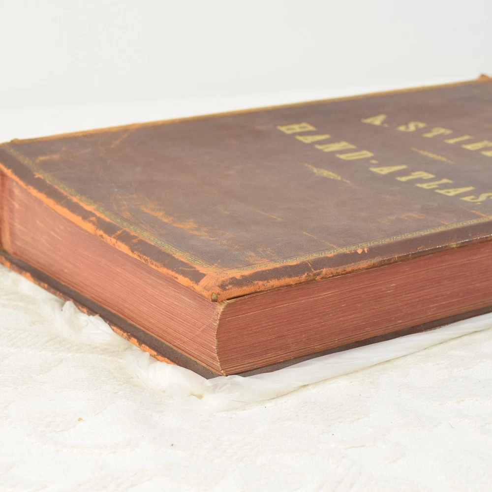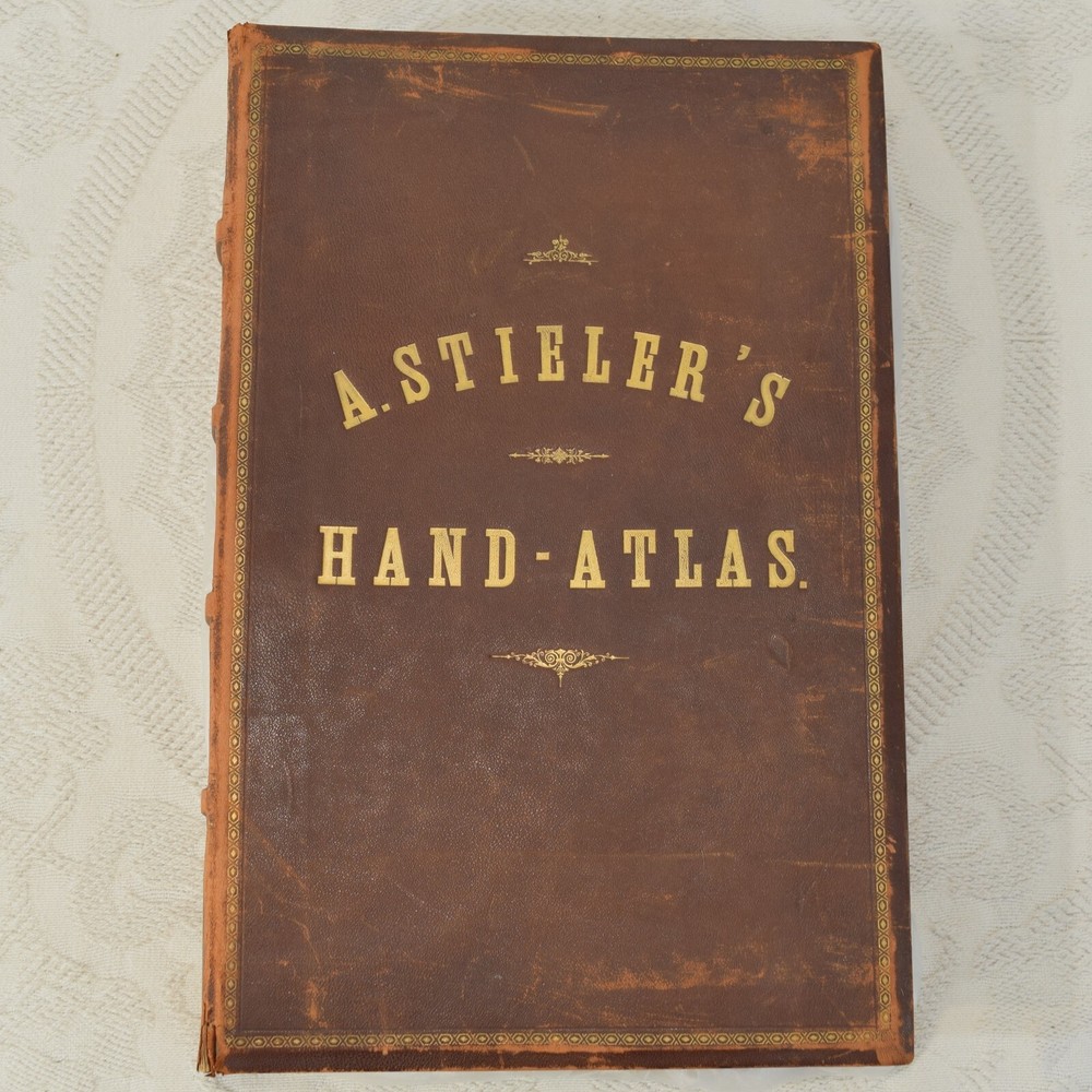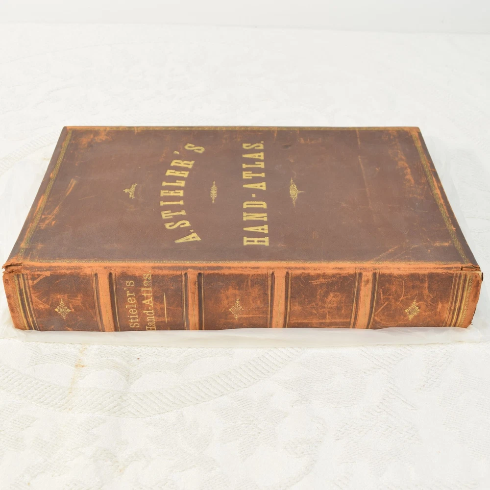 Antique A. Stieler’s HandAtlas 95 Maps Karten 7th Edition German Berghaus 1880 Amazing antique hand atlas with full size color maps and diagrams, written in German. 95 maps “Issued 1879-1882 under the direction of Hermann Berghaus, Vogel and Hermann Habenicht (1844–1917). Although the printing industry had already changed to lithography for some time, some maps in Stieler's Atlas were still reproduced by copper-plate printing on hand presses with hand colouring into the 1890s”. Richter Bros. Binders 294 West Water Street Milwaukee, Wisconsin Complete. Pages are in excellent condition, bright colors and print, little to no distressing. Cover is disintegrating and tattered; in need of restoration. Colorant and finish is rubbing off into powder. Measures 20” x 13” x 7” *Resale Holy Grail* is all about reducing waste. All items will be shipped in recycled packaging when possible. C2 #vintage #antique #book #leatherboundbook #atlas #worldatlas #artscrafts #maps #oldmaps #leatherbound #german