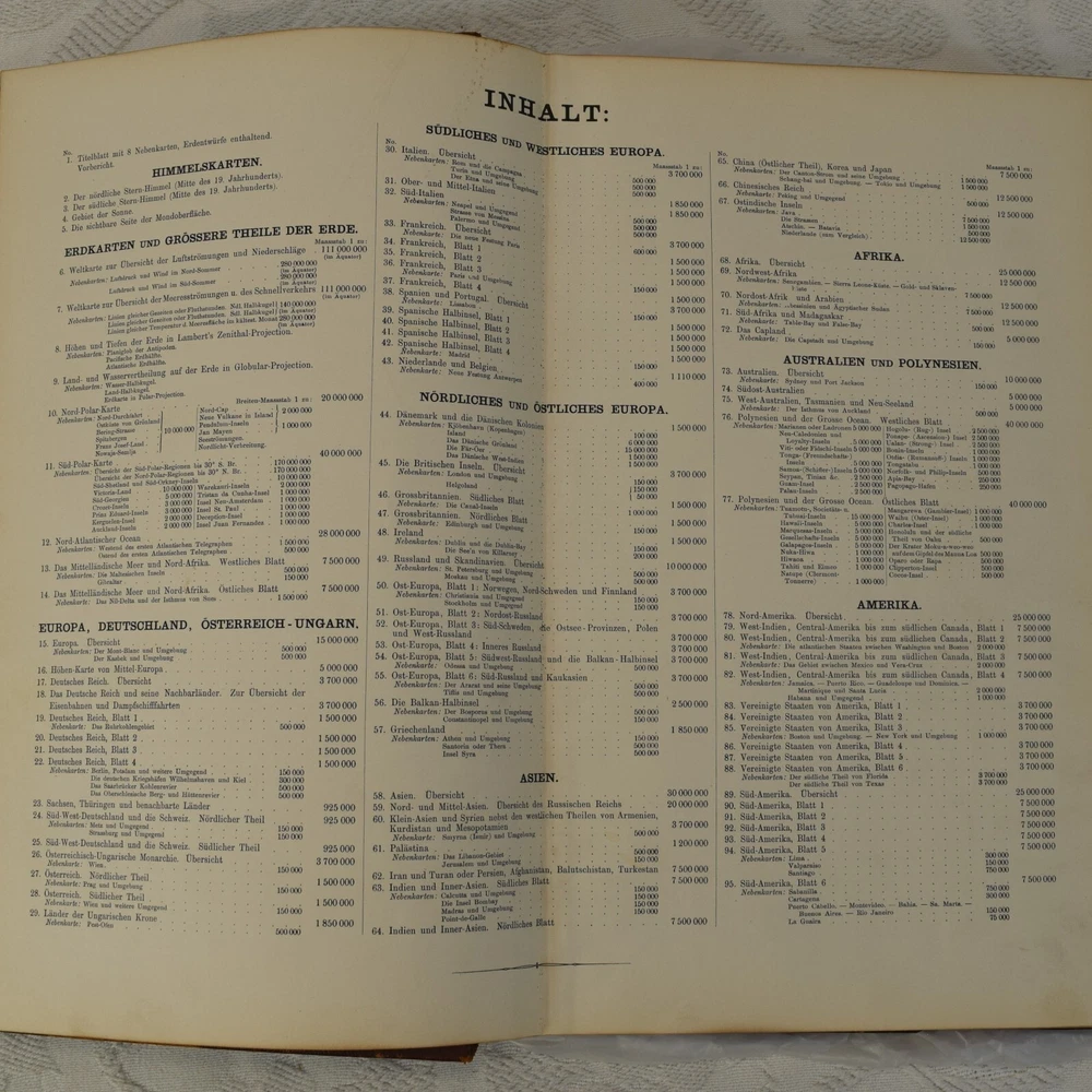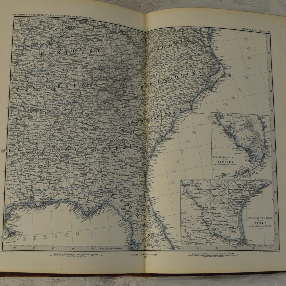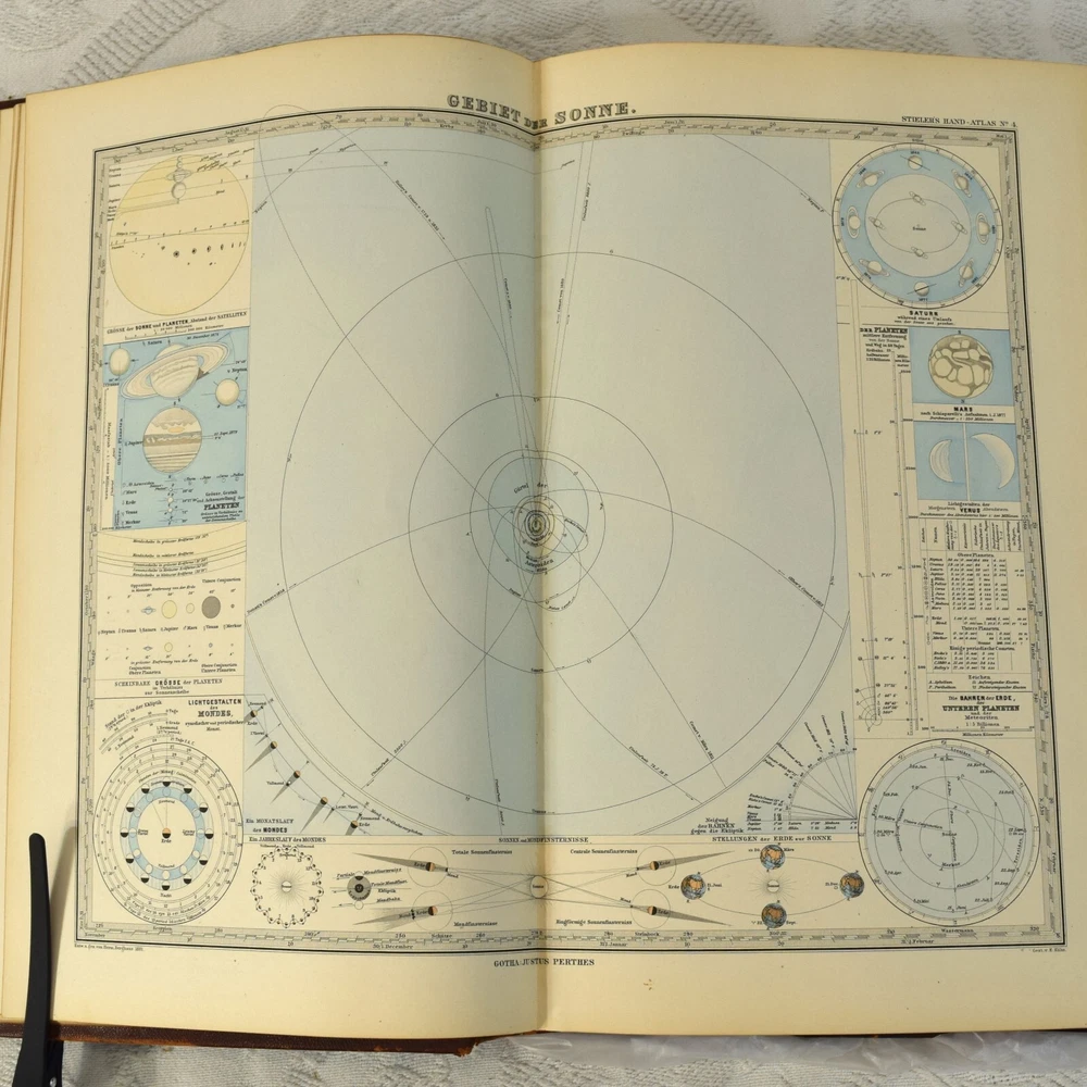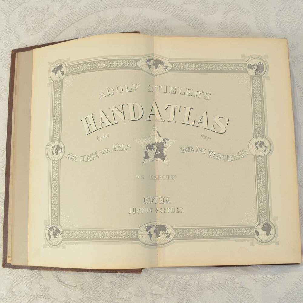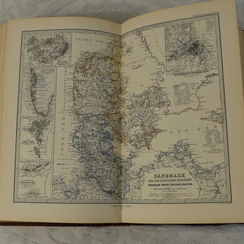 Antique A. Stieler’s HandAtlas 95 Maps Karten 7th Edition German Berghaus 1880 Amazing antique hand atlas with full size color maps and diagrams, written in German. 95 maps “Issued 1879-1882 under the direction of Hermann Berghaus, Vogel and Hermann Habenicht (1844–1917). Although the printing industry had already changed to lithography for some time, some maps in Stieler's Atlas were still reproduced by copper-plate printing on hand presses with hand colouring into the 1890s”. Richter Bros. Binders 294 West Water Street Milwaukee, Wisconsin Complete. Pages are in excellent condition, bright colors and print, little to no distressing. Cover is disintegrating and tattered; in need of restoration. Colorant and finish is rubbing off into powder. Measures 20” x 13” x 7” *Resale Holy Grail* is all about reducing waste. All items will be shipped in recycled packaging when possible. C2 #vintage #antique #book #leatherboundbook #atlas #worldatlas #artscrafts #maps #oldmaps #leatherbound #german