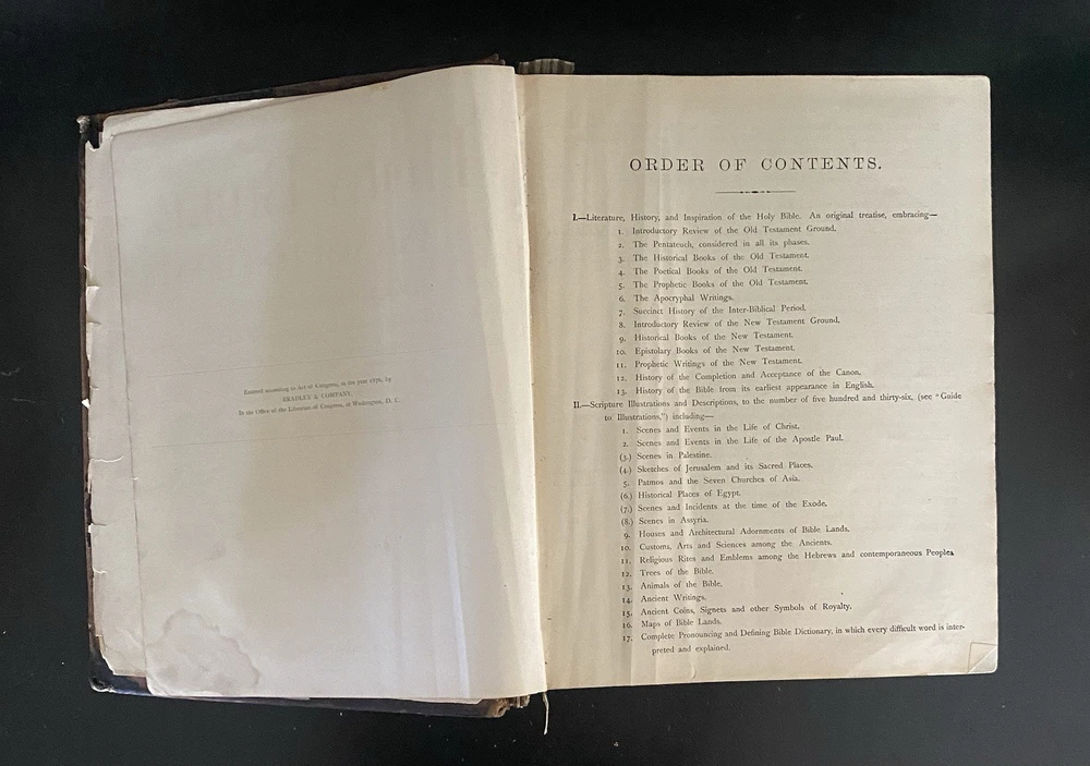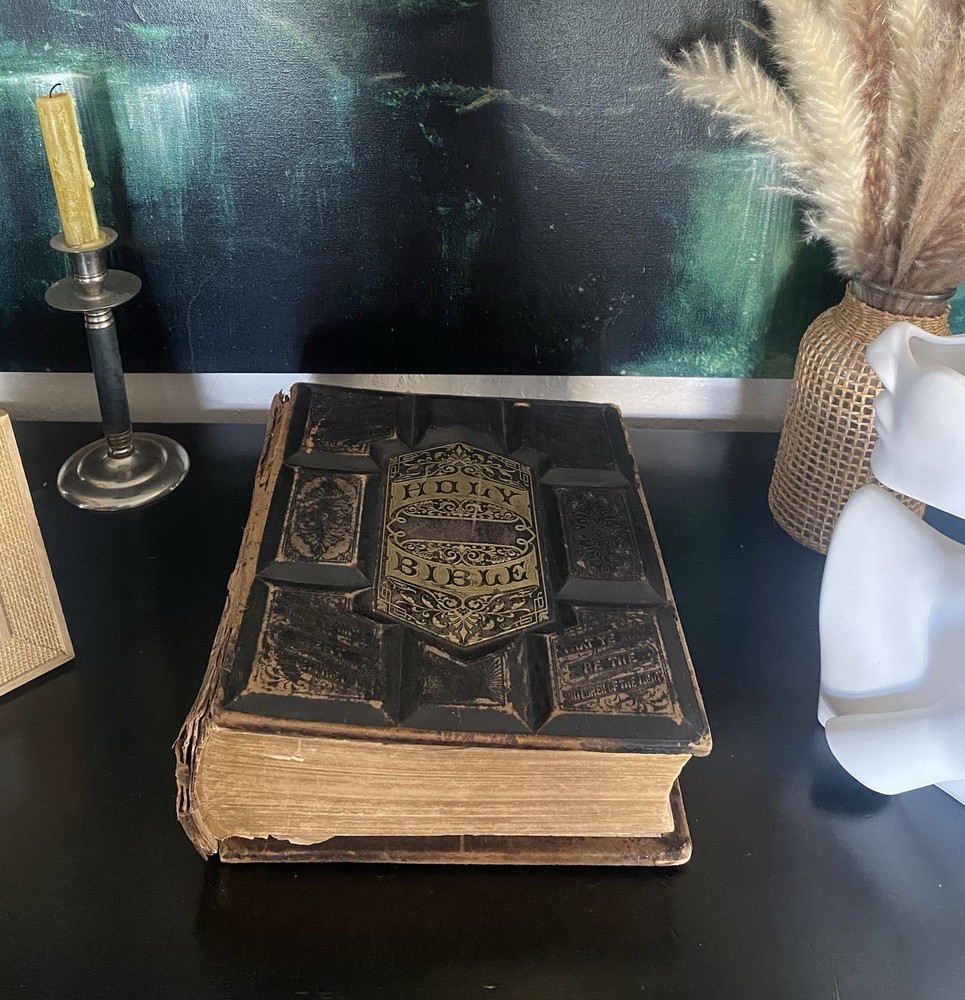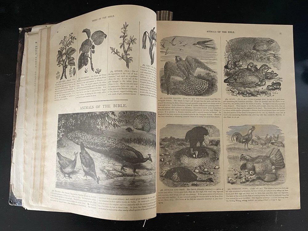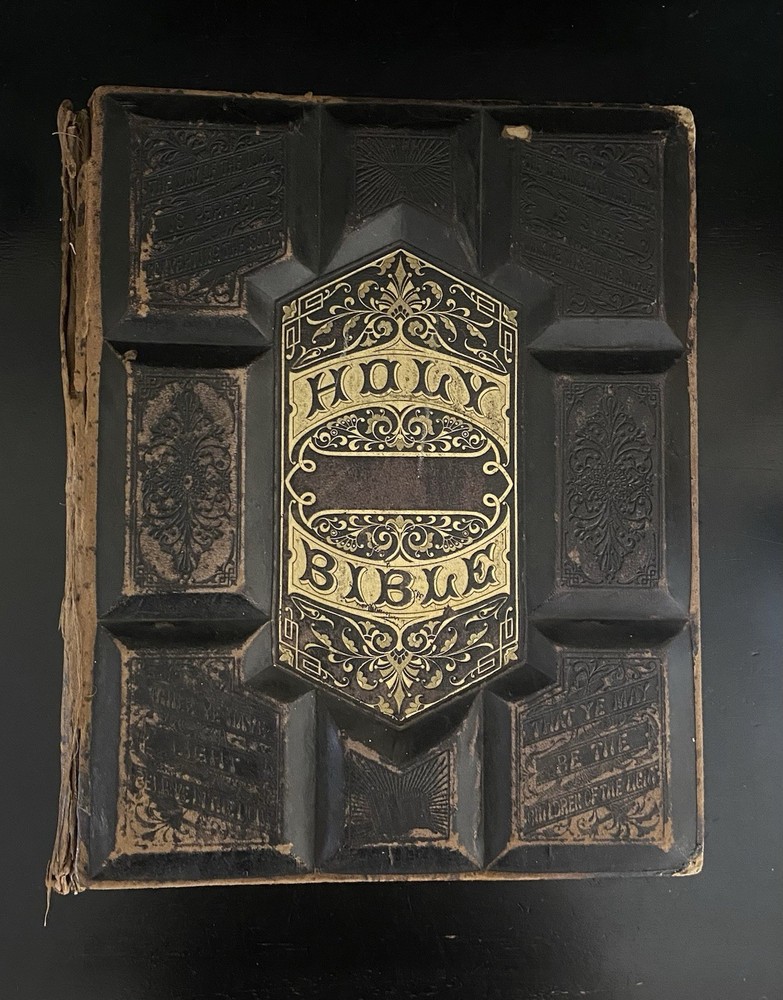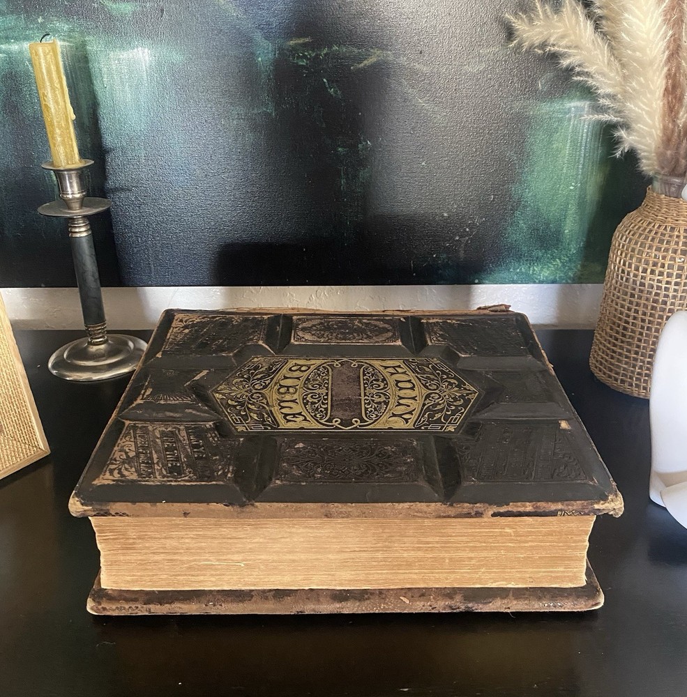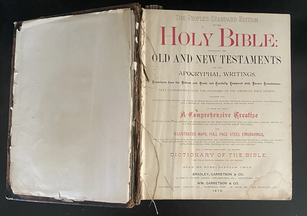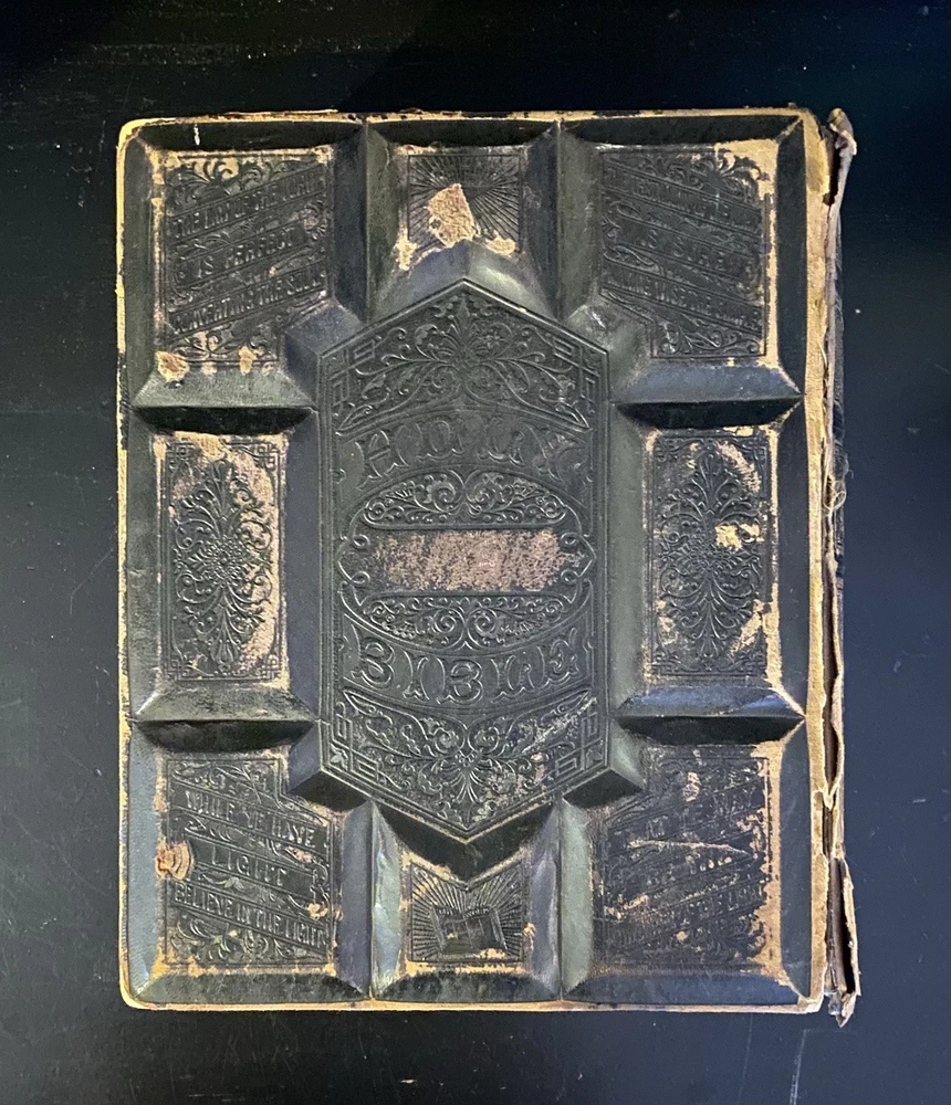 Leatherbound Antique Personalized Family Holy Bible by Bradley, Garretson & Co. 1879. Bible includes illustrated maps, full page steel engravings. Over 900 pages. This is the Peoples Standard Edition of New and Old Testaments and entered according to Act of Congress in 1876. This unique antique is extremely rare and includes personalized family history/inserts, memorials, mementos, keepsakes, and even a 4 leaf clover 🍀 from the 19 century! Bible is very old and shows its age. The hard cover binding is not completely attached throughout. The top and bottom of cover are not attached which may be repairable. Please review photos. Bible measures: 12.25” x 10” x 4” Bible weighs: about 11 pounds Feedback: Our goal is 100% customer satisfaction. If you are satisfied with your purchase, please be sure to leave POSITIVE feedback! Please inform us of any problems or issues that may arise. We request that you give us the opportunity to resolve the issue prior to leaving negative feedback.
